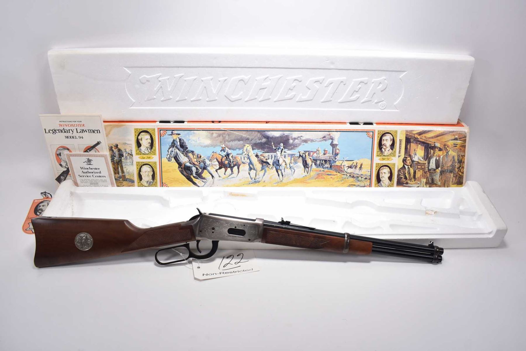 Winchester Model 94 Legendary Lawmen Commemorative Saddle Ring Carbine .30 - 30 Win Cal w/ 16" bbl [ appears as new, unfired, in original foam lined box, some damage to the sleeve, w/ booklet, hanging tag, etc., receiver and barrel band are tarnished, Circa 1977 One of 19,999 Production ] Ser # LL 12158