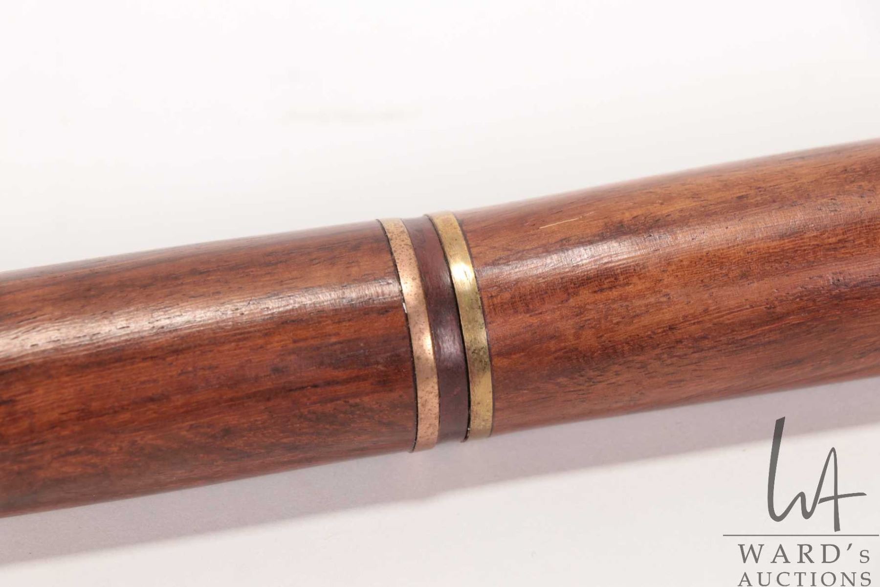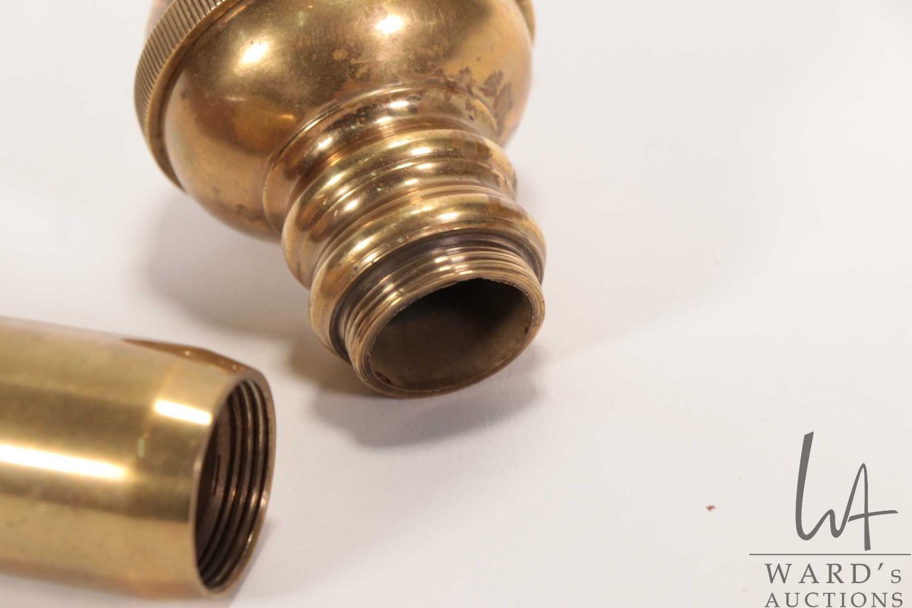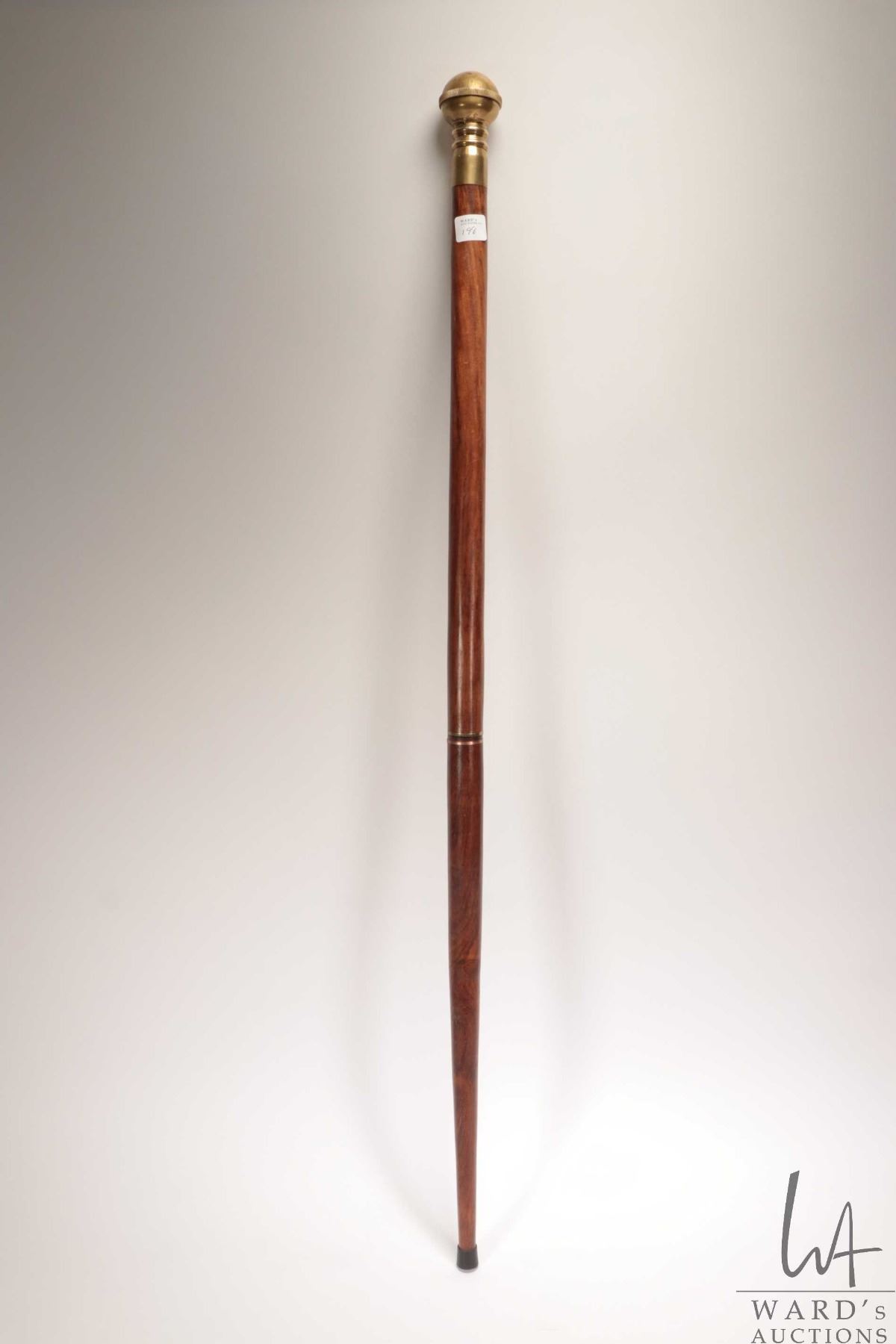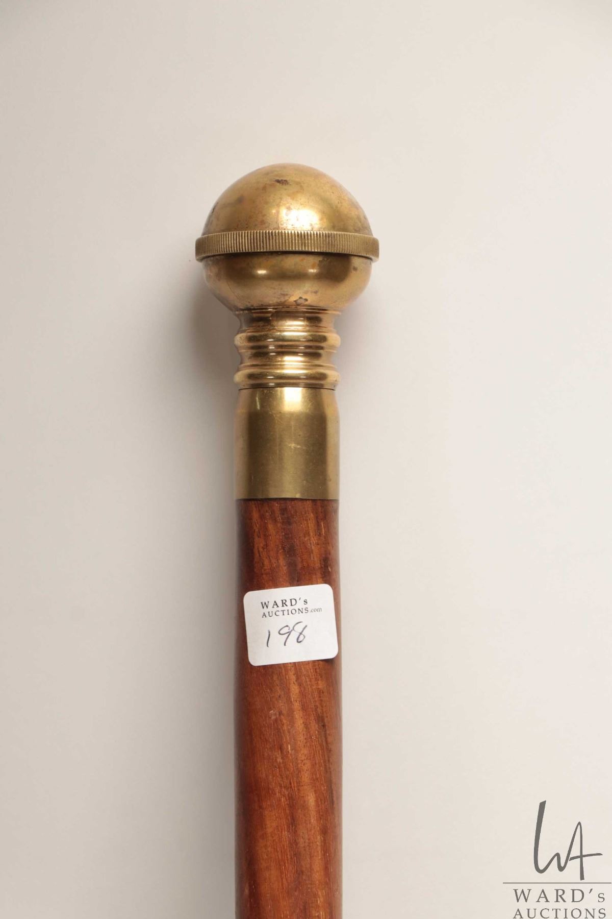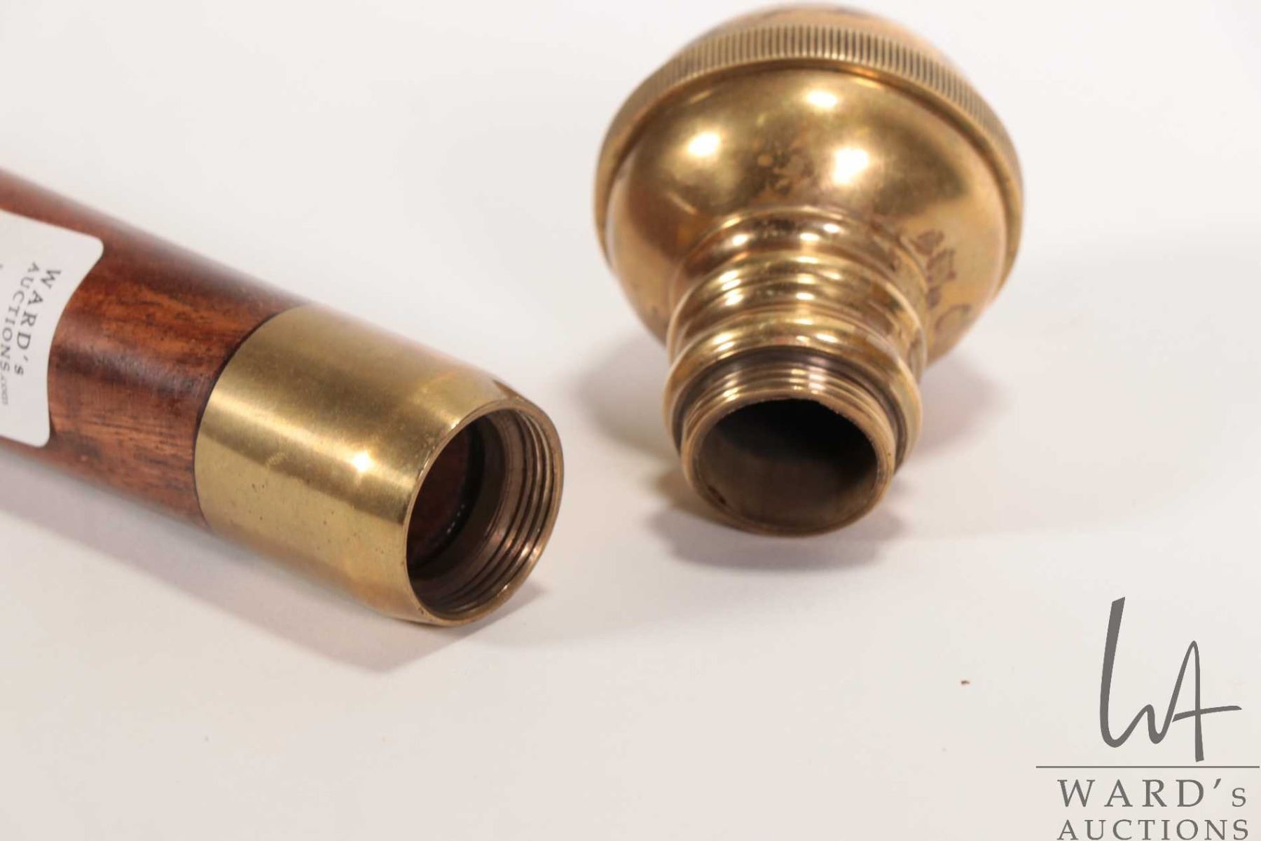 Wood and brass walking stick with drinks vial compartment, note: glass vial missing, 38" in height