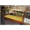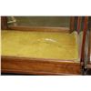 Wood and glass display cabinet 36" H X 59" W X 23" D, note: front glass is cracked, see photos