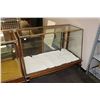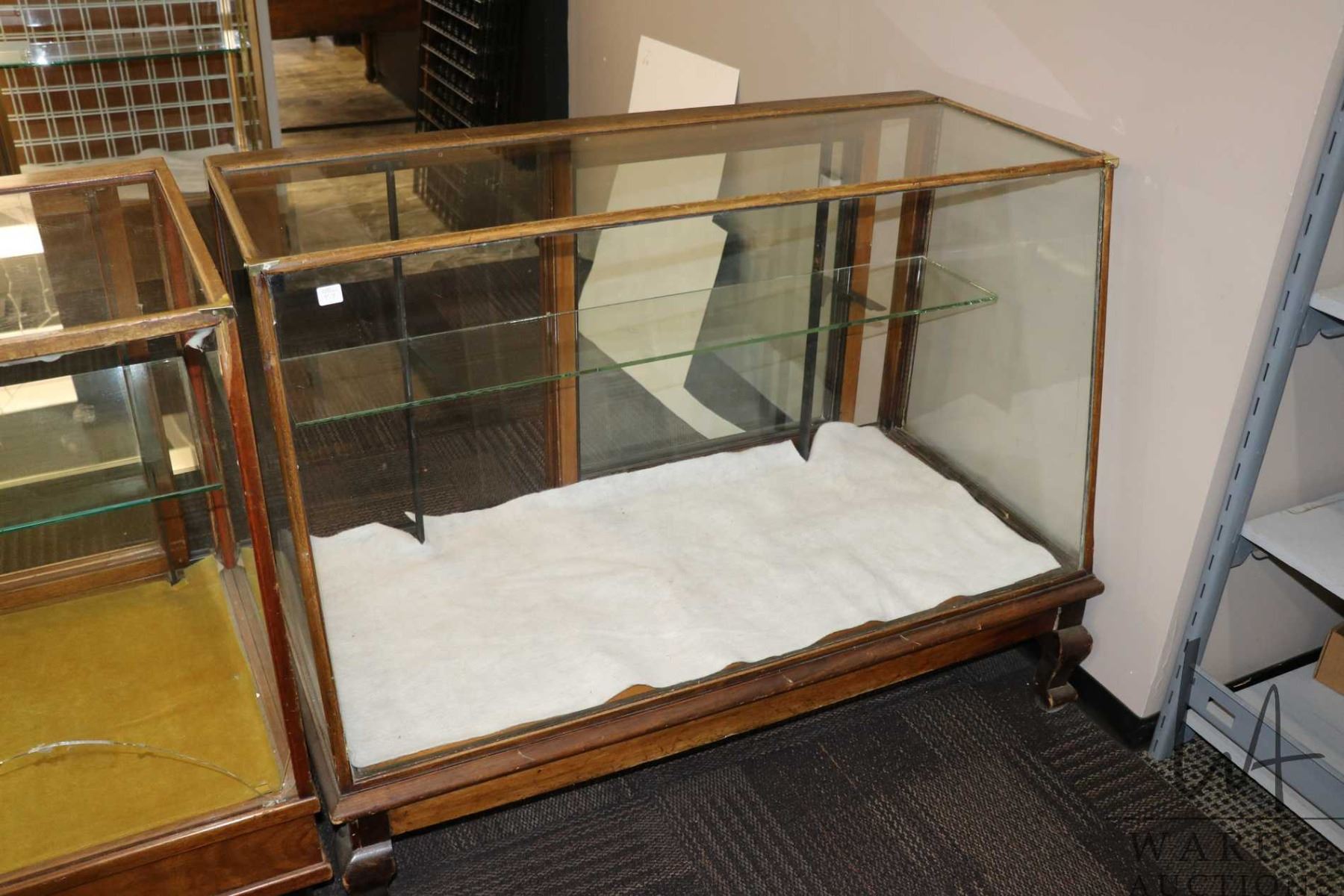 Wood and glass display cabinet with sloped front, 35 1/2" H X 46" W X 24" D