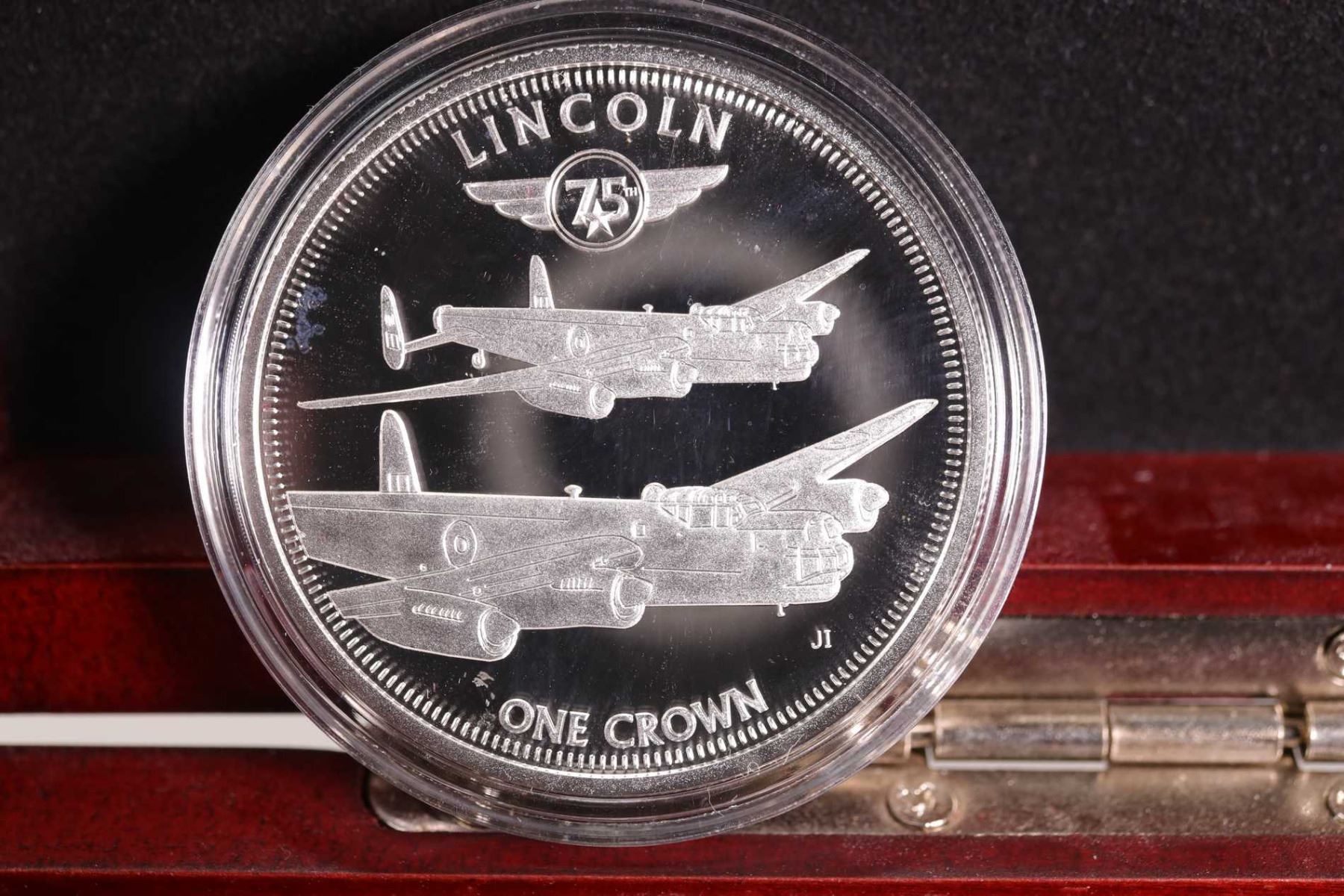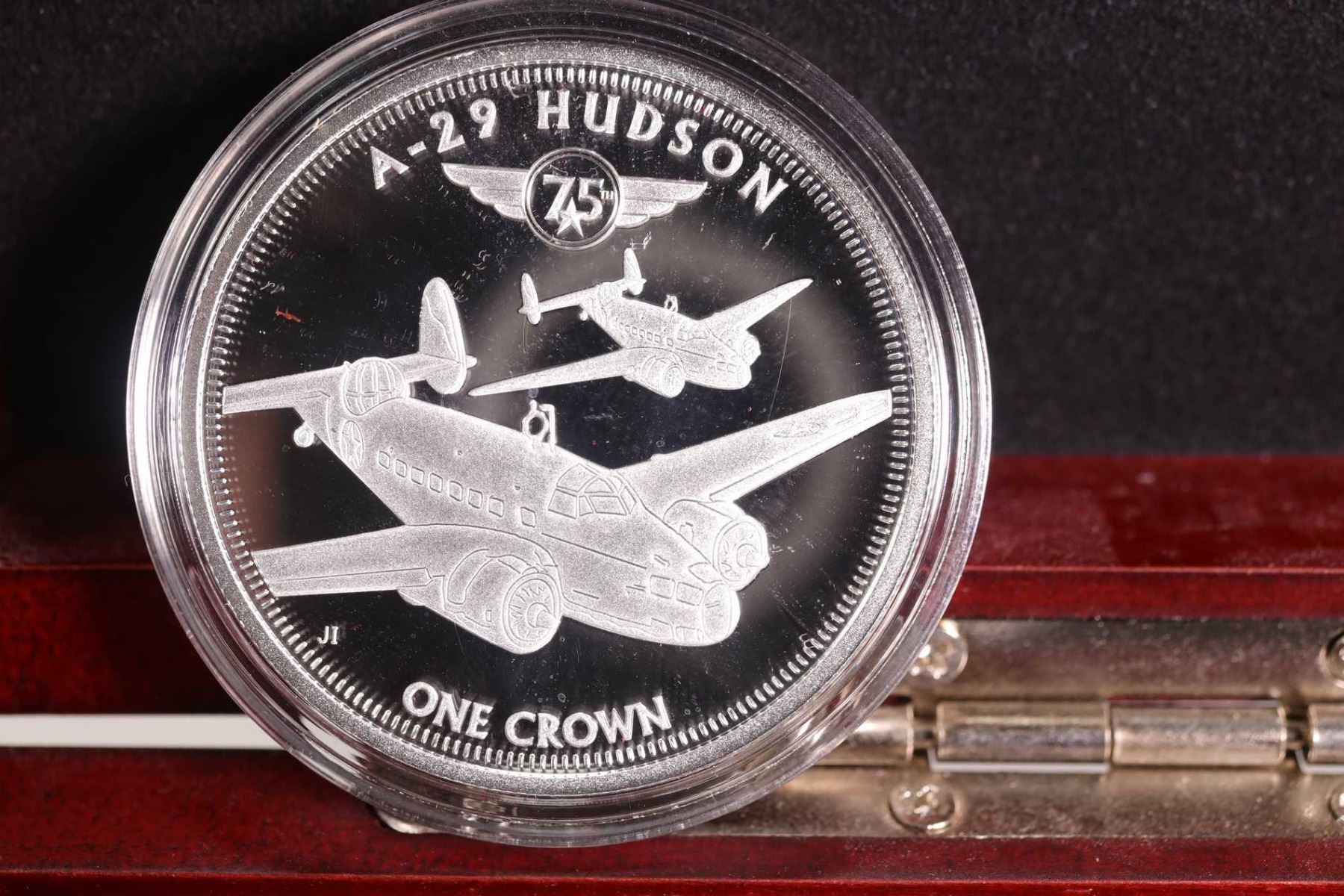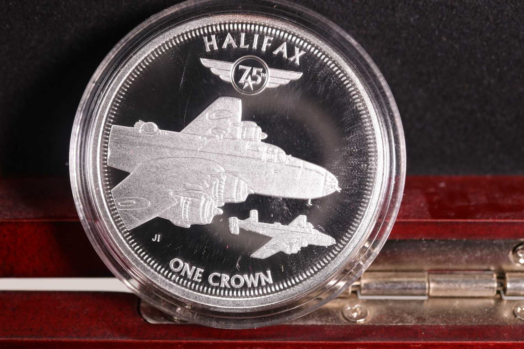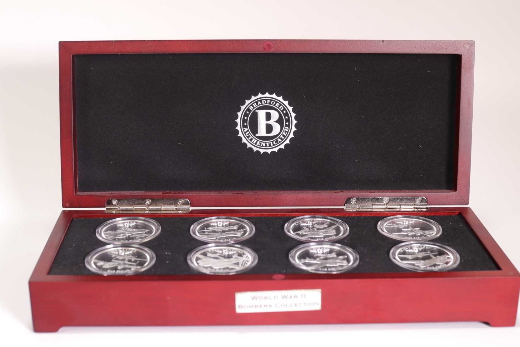 Wood cased Bradford Exchange Mint set of eight silver plated " World War II Bomber Collection" one crown coin set including "Lancaster", "Halifax", "Lincoln", "A-29 Hudson", " Stirling", "PV-1 Ventura", "Whitley" and "Manchester". Each coin originally retailing for $59.00