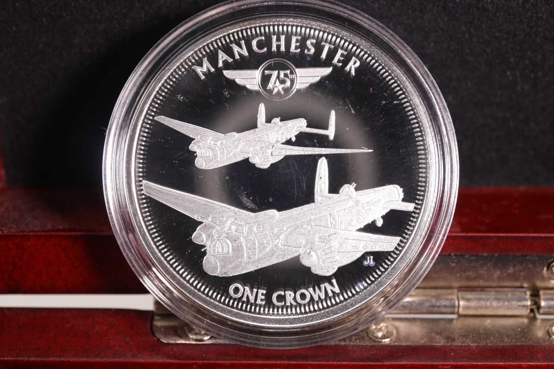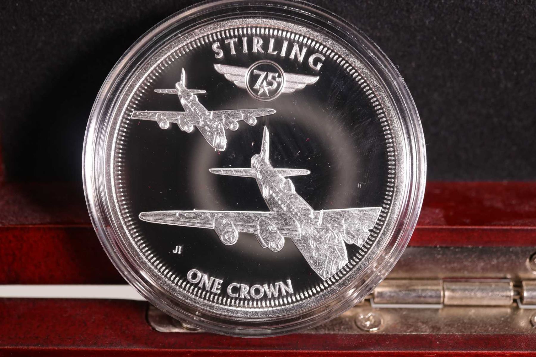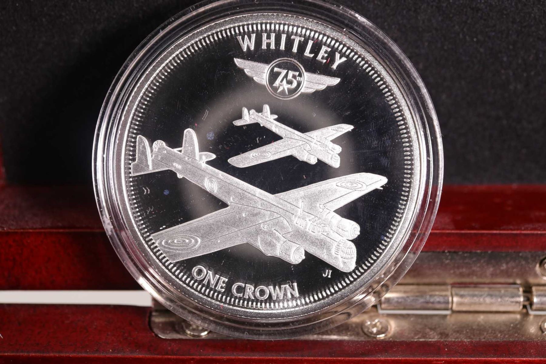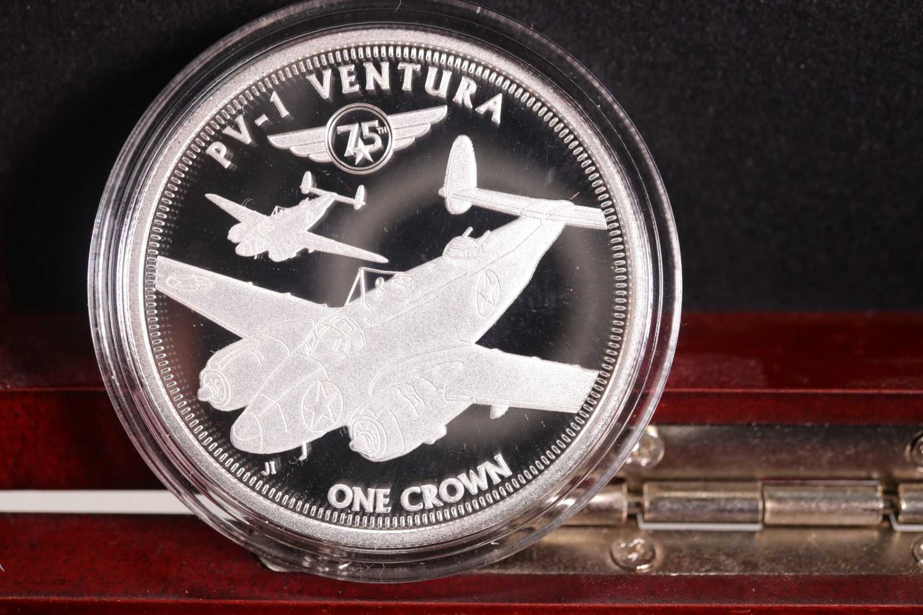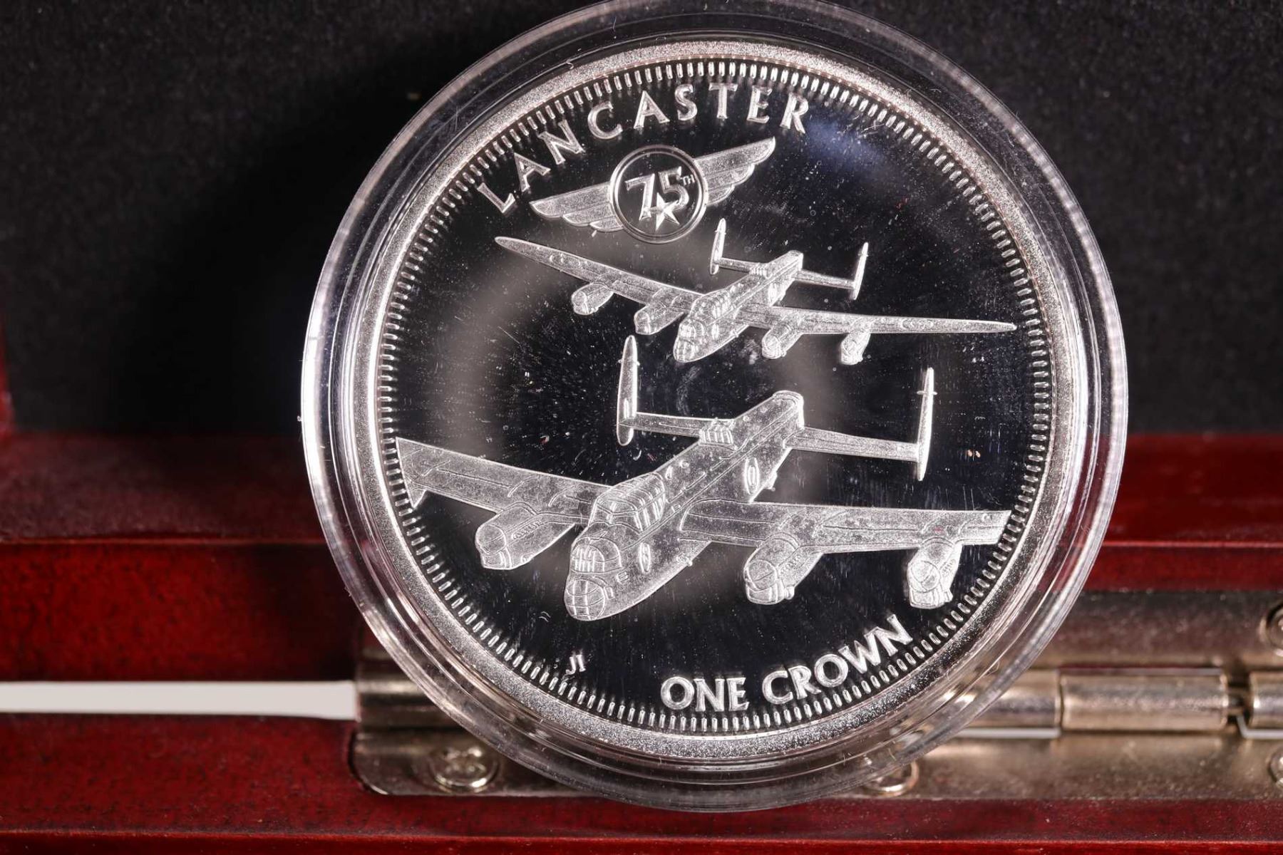 Wood cased Bradford Exchange Mint set of eight silver plated " World War II Bomber Collection" one crown coin set including "Lancaster", "Halifax", "Lincoln", "A-29 Hudson", " Stirling", "PV-1 Ventura", "Whitley" and "Manchester". Each coin originally retailing for $59.00