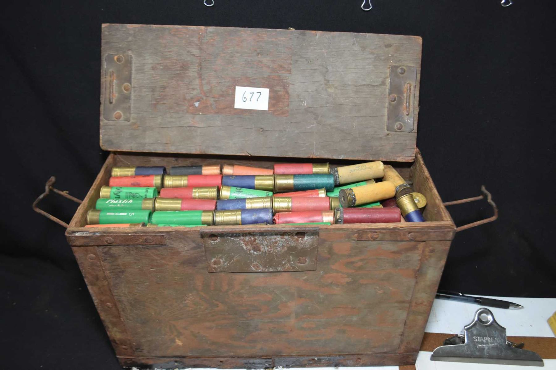 Wooden ammunition box of approximately 360 assorted .12 gauge rounds, mostly plastic