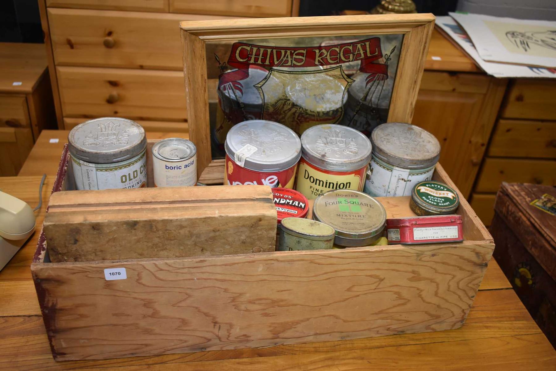 Wooden box containing a large selection of tobacco tins, wooden candle molds, bar mirror etc.