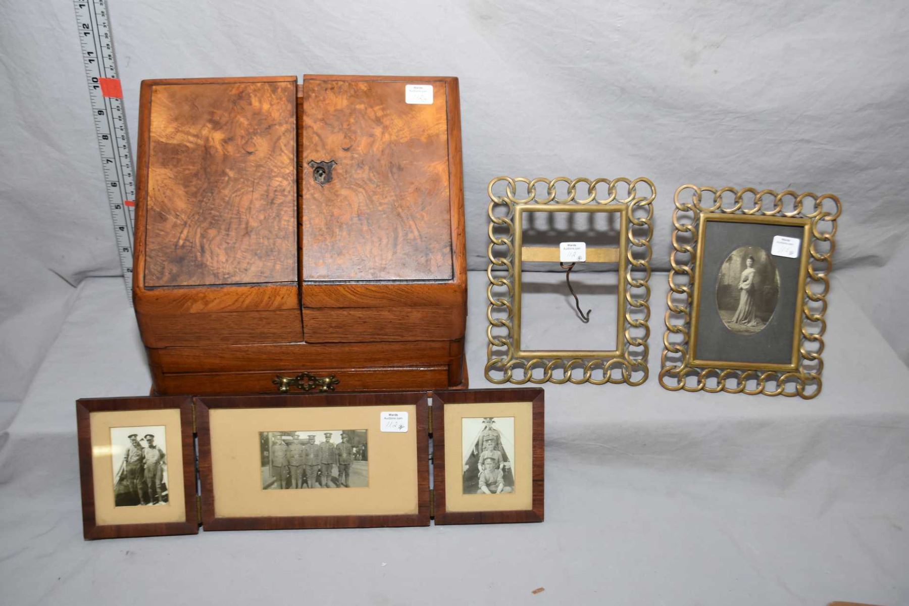Wooden burl wood letter box with drawer, plus two antique brass photo frames, one with original bevelled glass and a wooden three panel frame featuring WWII soldiers