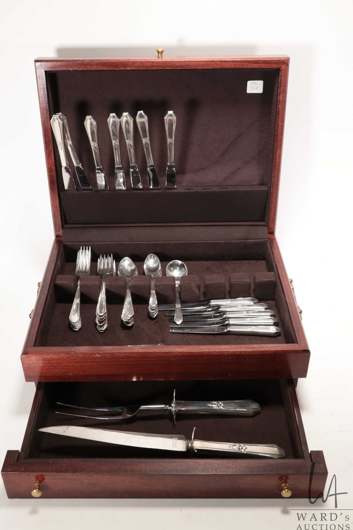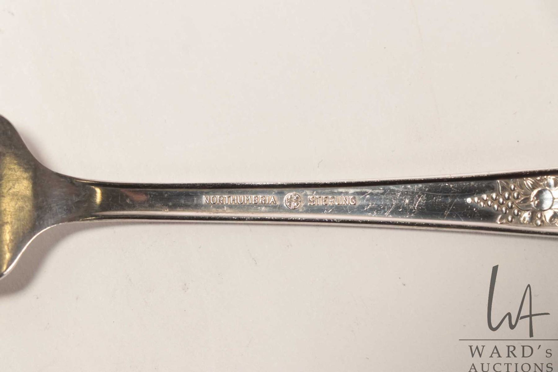 Wooden canteen containing a selection of Northumbria sterling silver flatware including seven dinner knives, six dinner forks, eight dessert/ salad forks, eight teaspoons, one berry spoon, seven spreaders plus a carving knife and fork