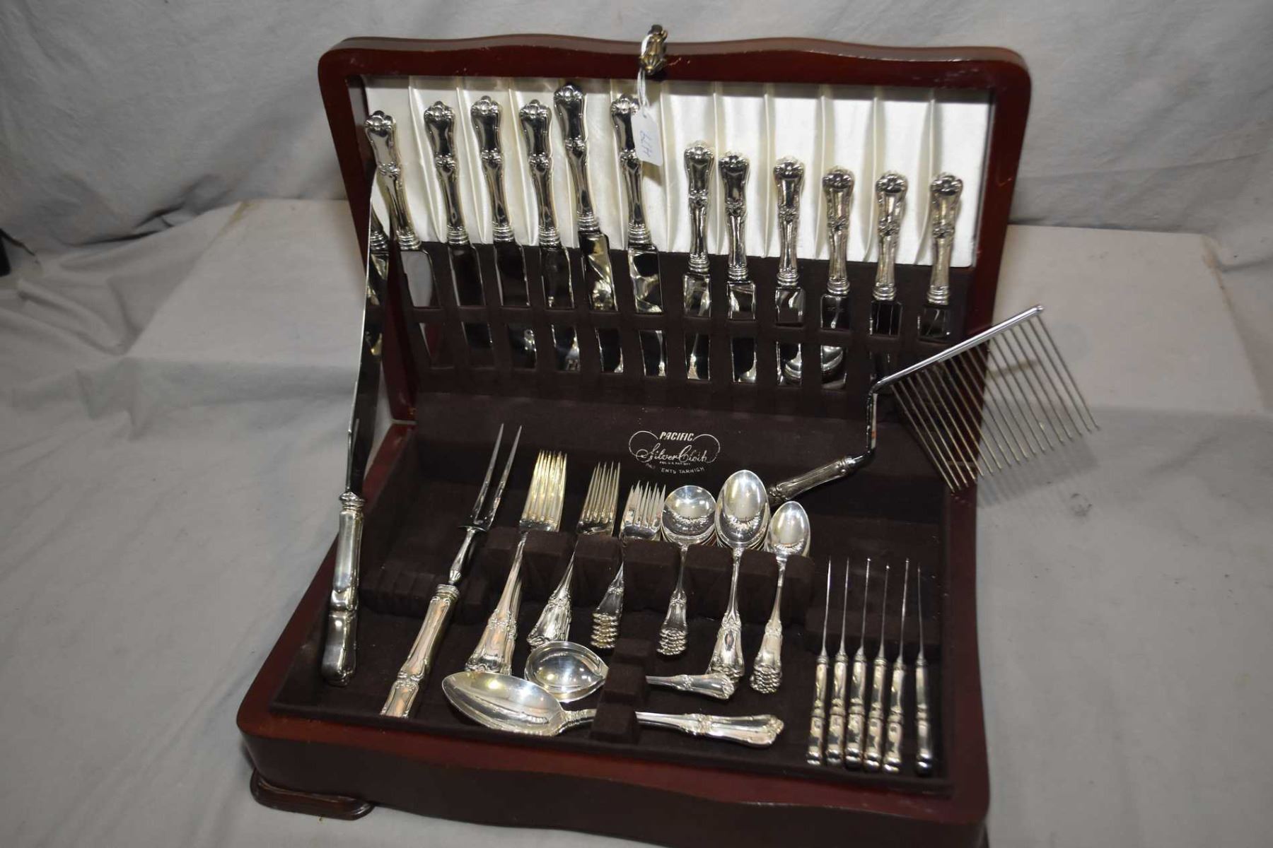 Wooden canteen containing six each of Birks Francis I sterling flatware including dinner knives, dinner forks, luncheon knives, luncheon forks, salad/dessert forks, tea, table and soup spoons and spreaders plus carving knife and fork, cake comb, two serving spoons, and two berry spoons