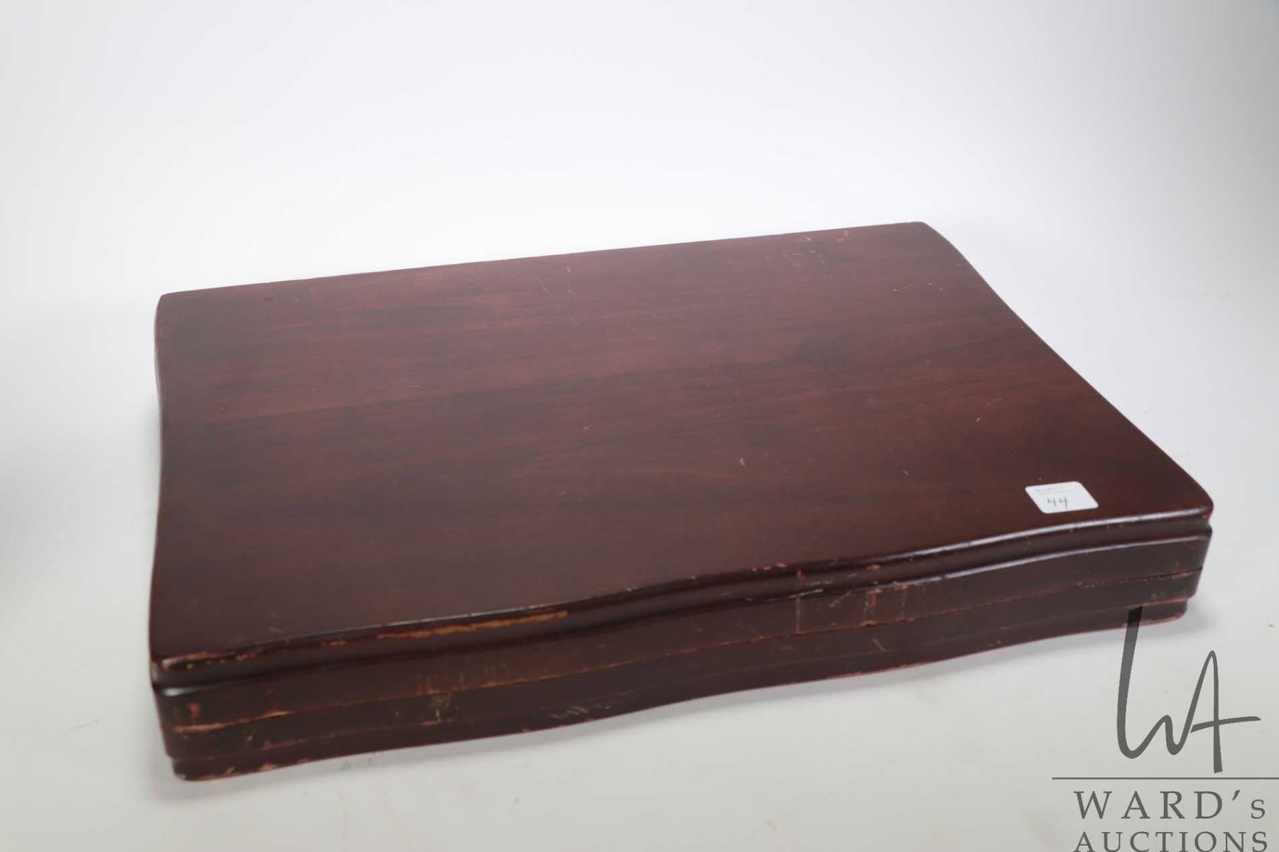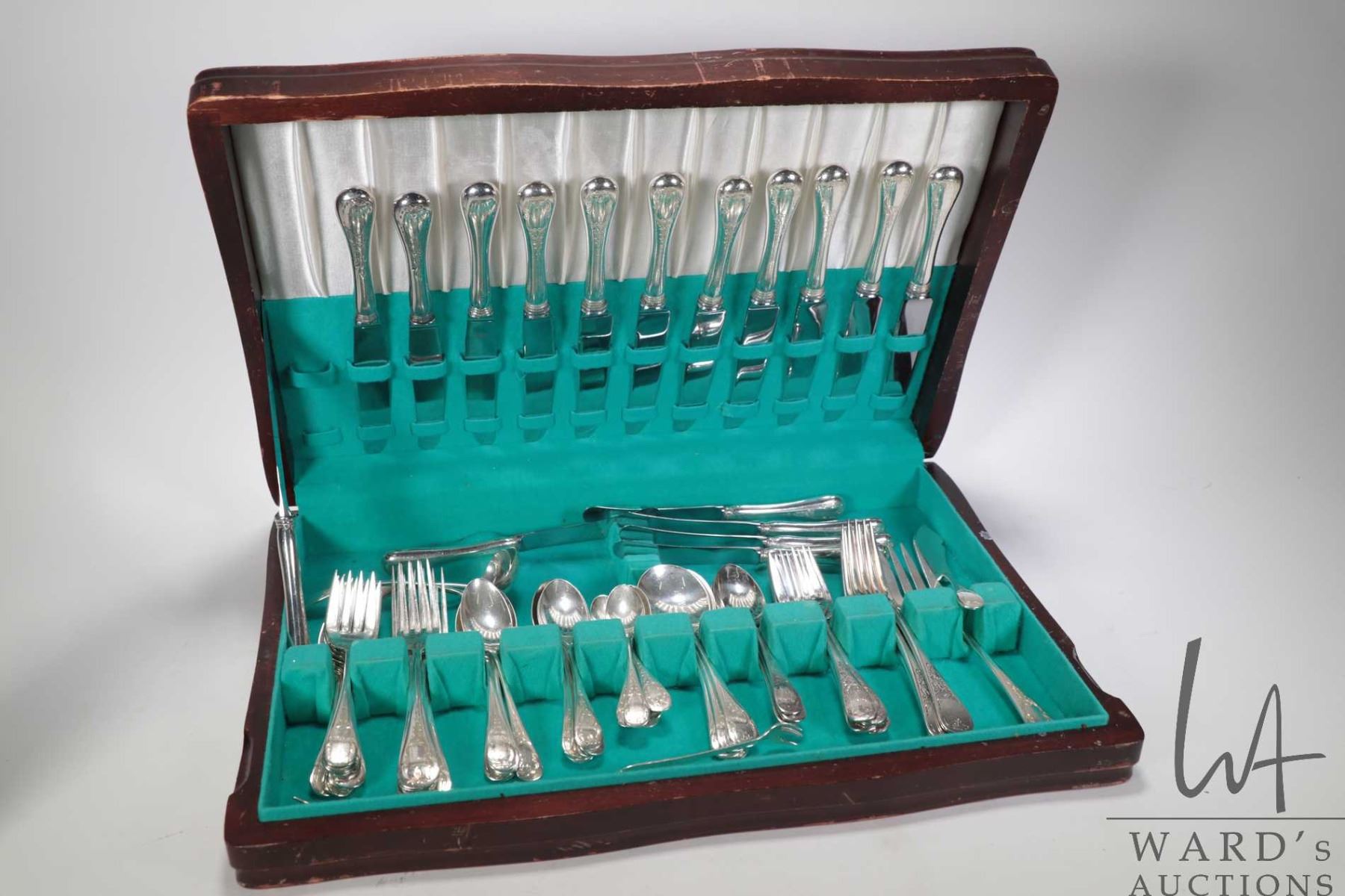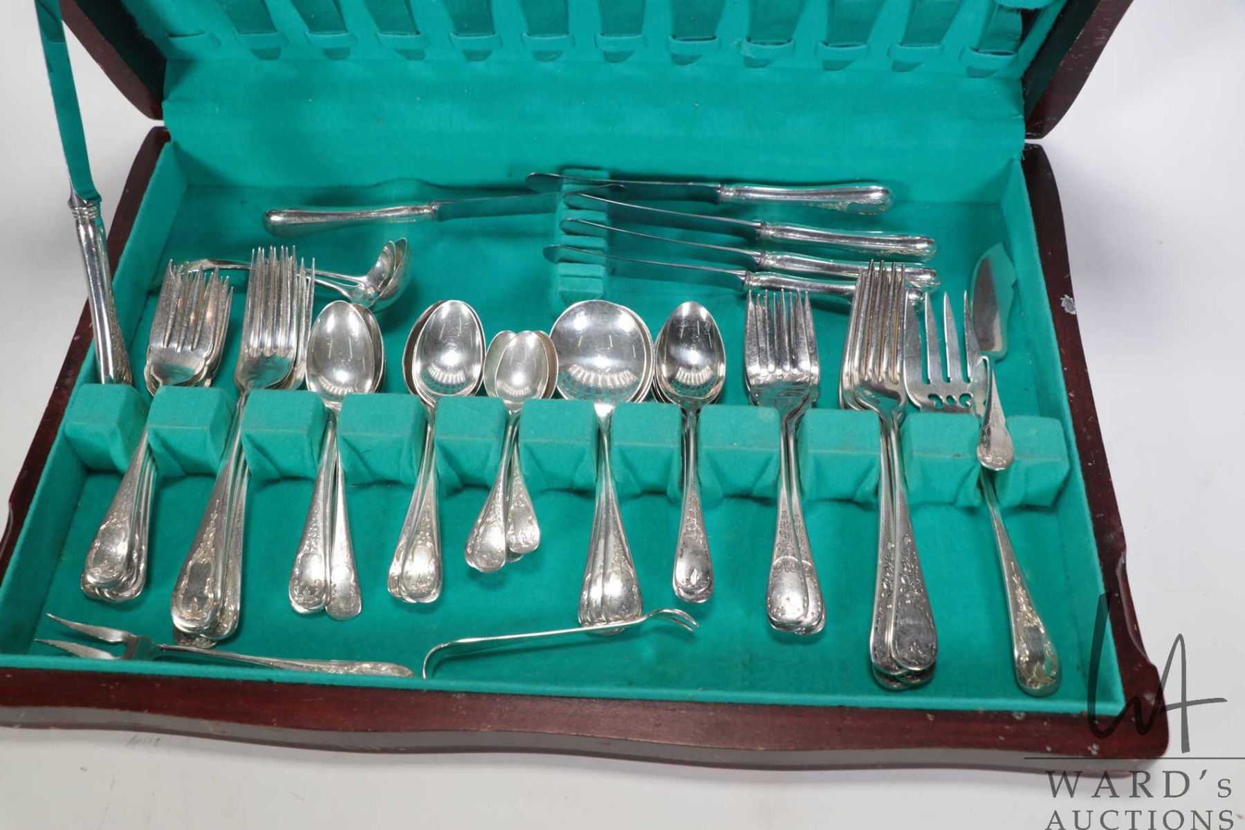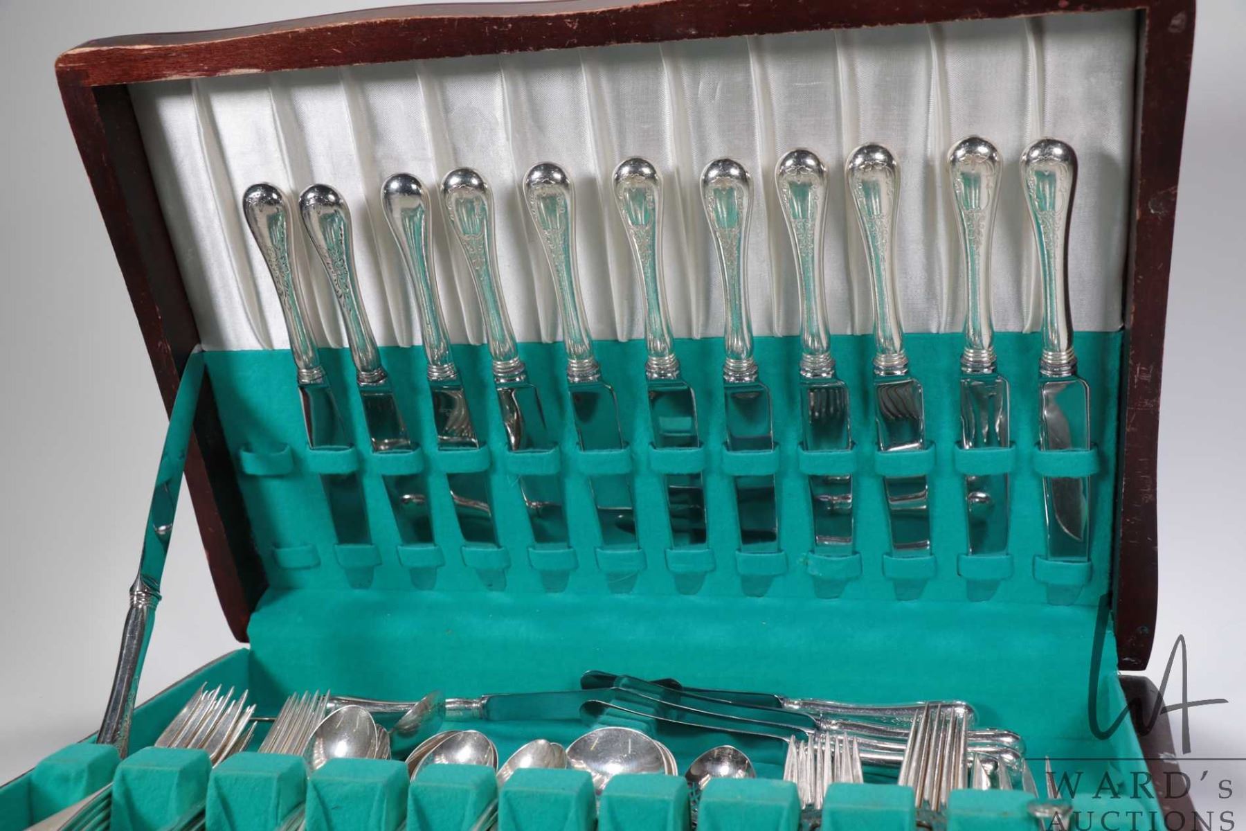 Wooden canteen containing some sterling and some plated silver flatware, 54 pieces are sterling and 16 pieces are plated.