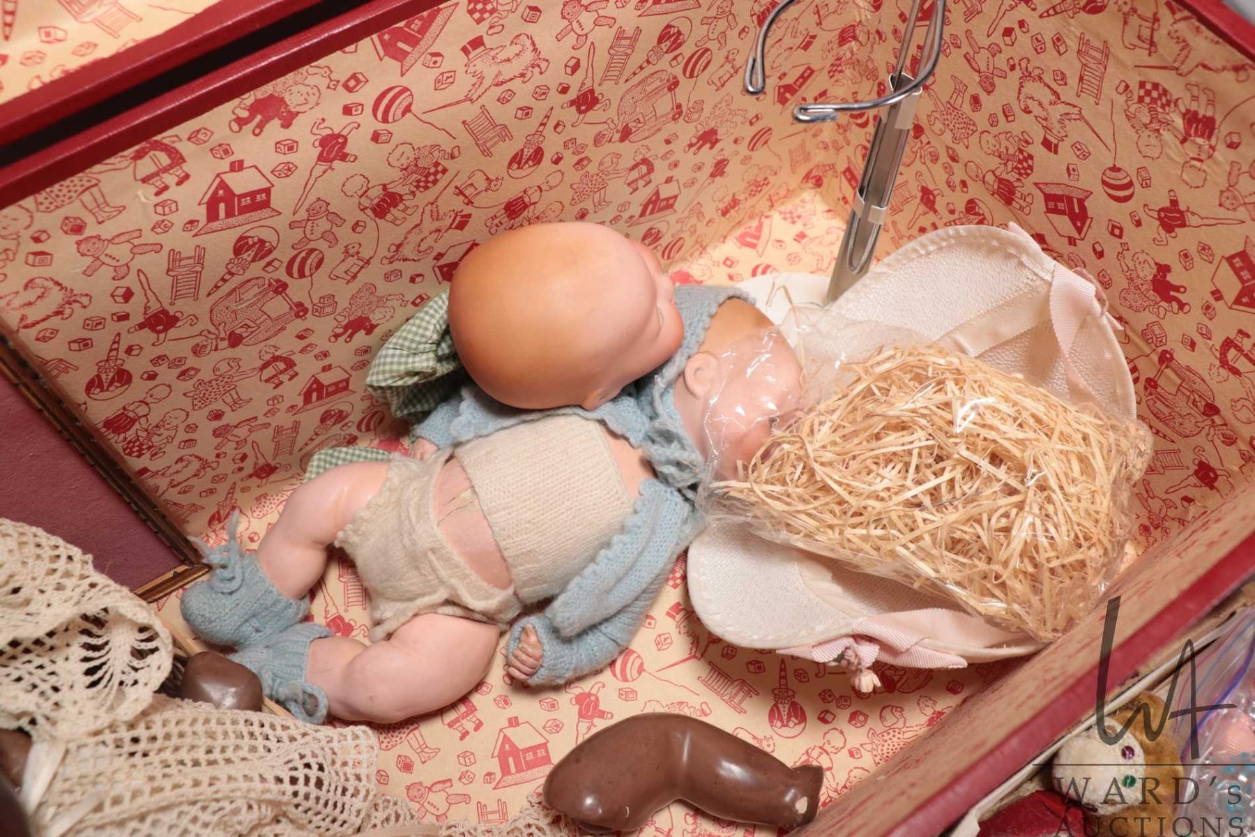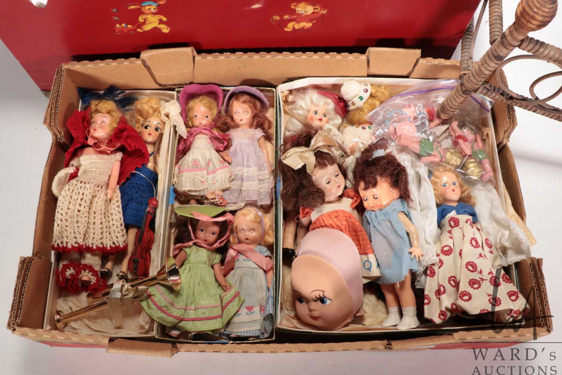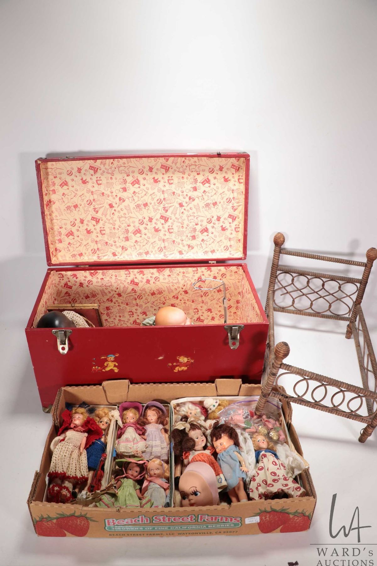 Wooden doll trunk and a selection of vintage small dolls, bisque doll head, bisque doll with cracked head, composition doll in pieces, doll bed etc.