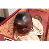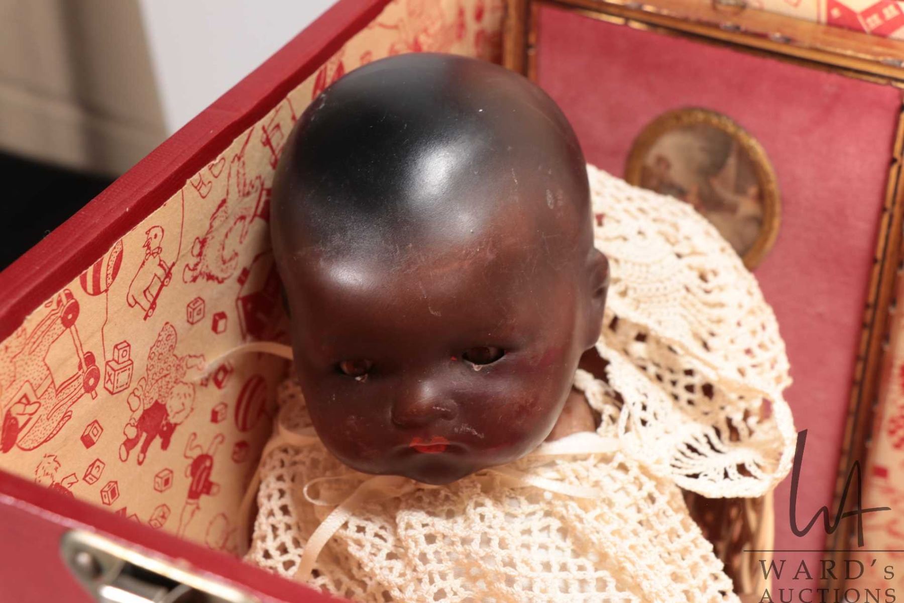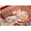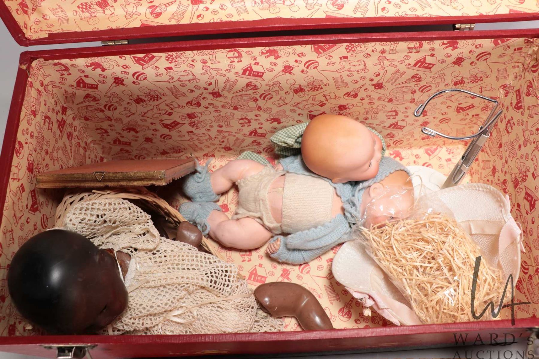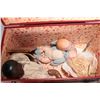 Wooden doll trunk and a selection of vintage small dolls, bisque doll head, bisque doll with cracked