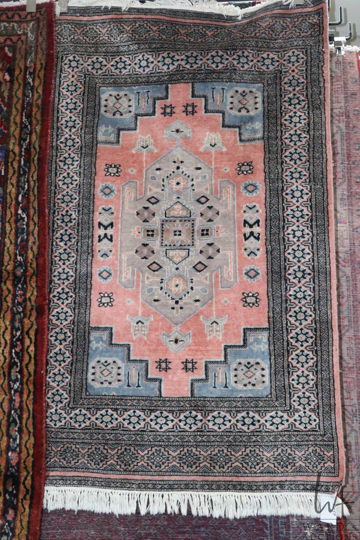 Wool blend throw carpet with center medallion, fringed edge and highlights of soft red, blues, black etc. 37" X 59"