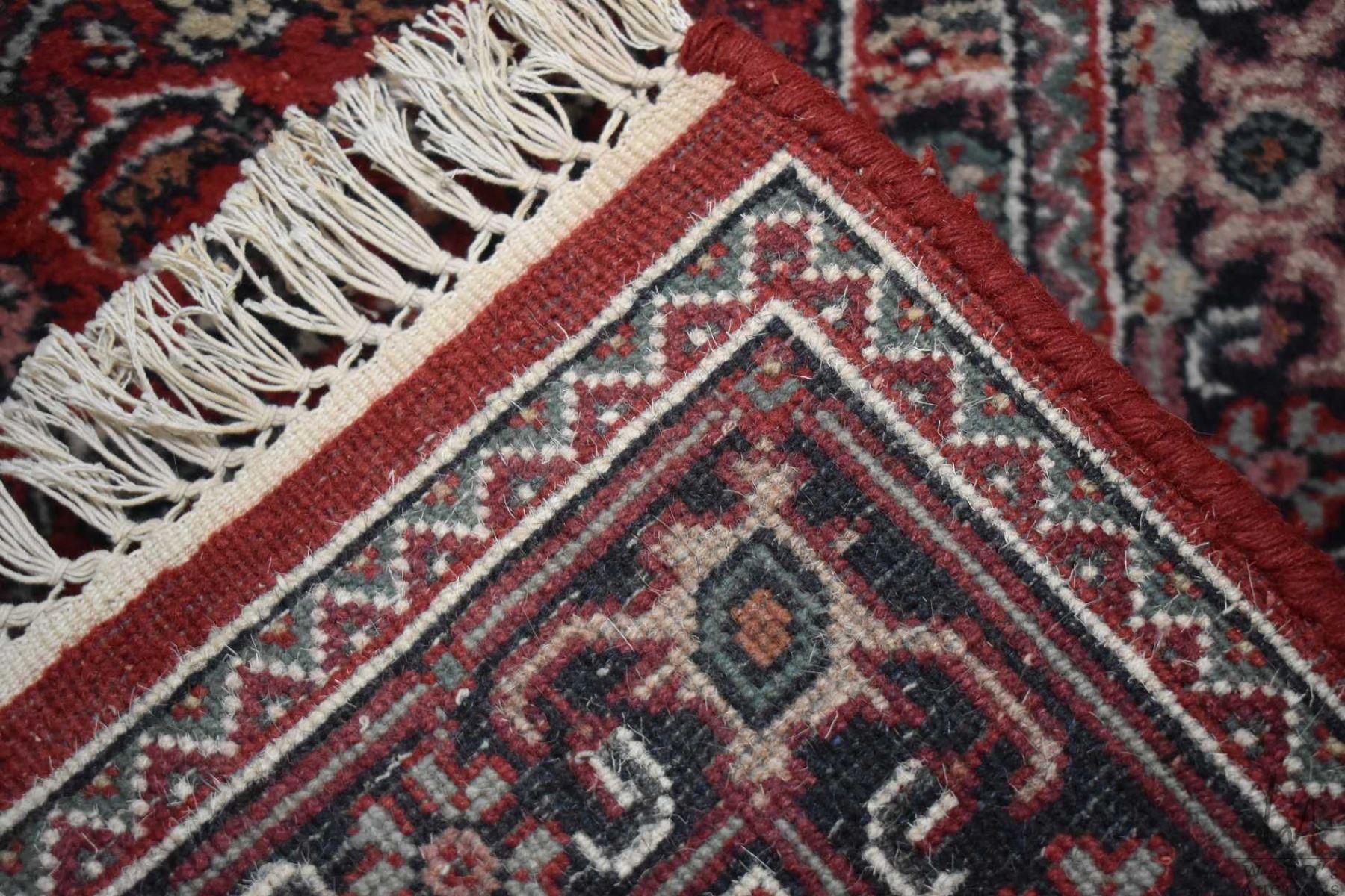 Wool carpet runner with multiple medallions, red background and overall floral design and highlights of cream, pink, green etc. 34" X 178"