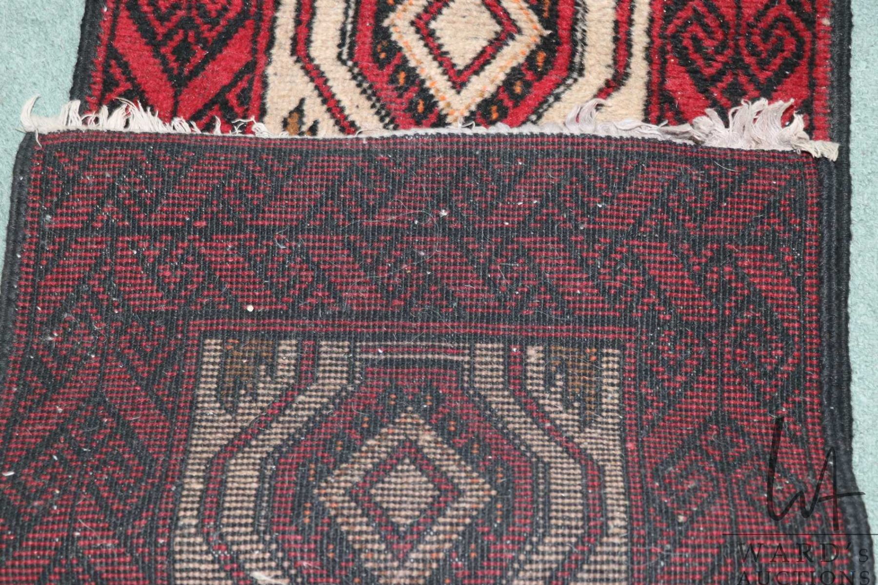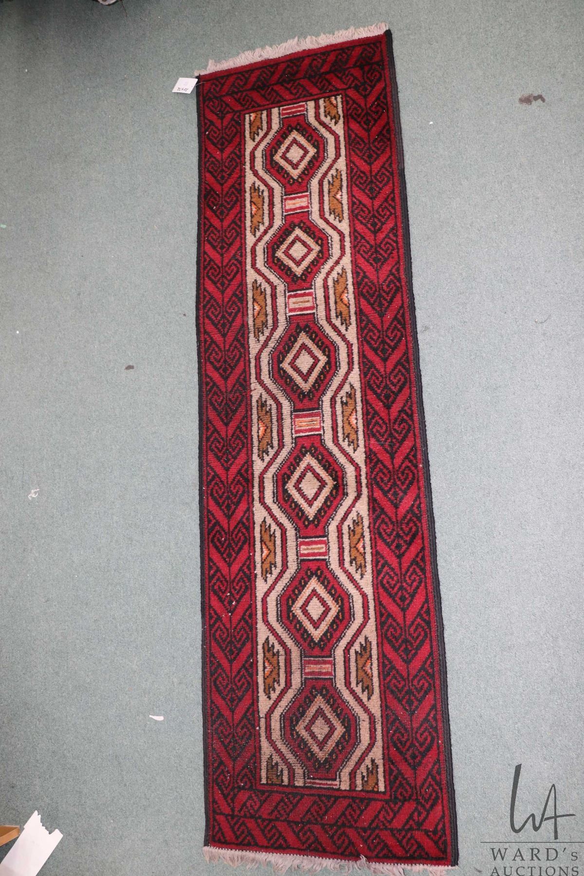 Wool carpet runner with red background, geometric design and highlights of black and taupe, 20" X 72"