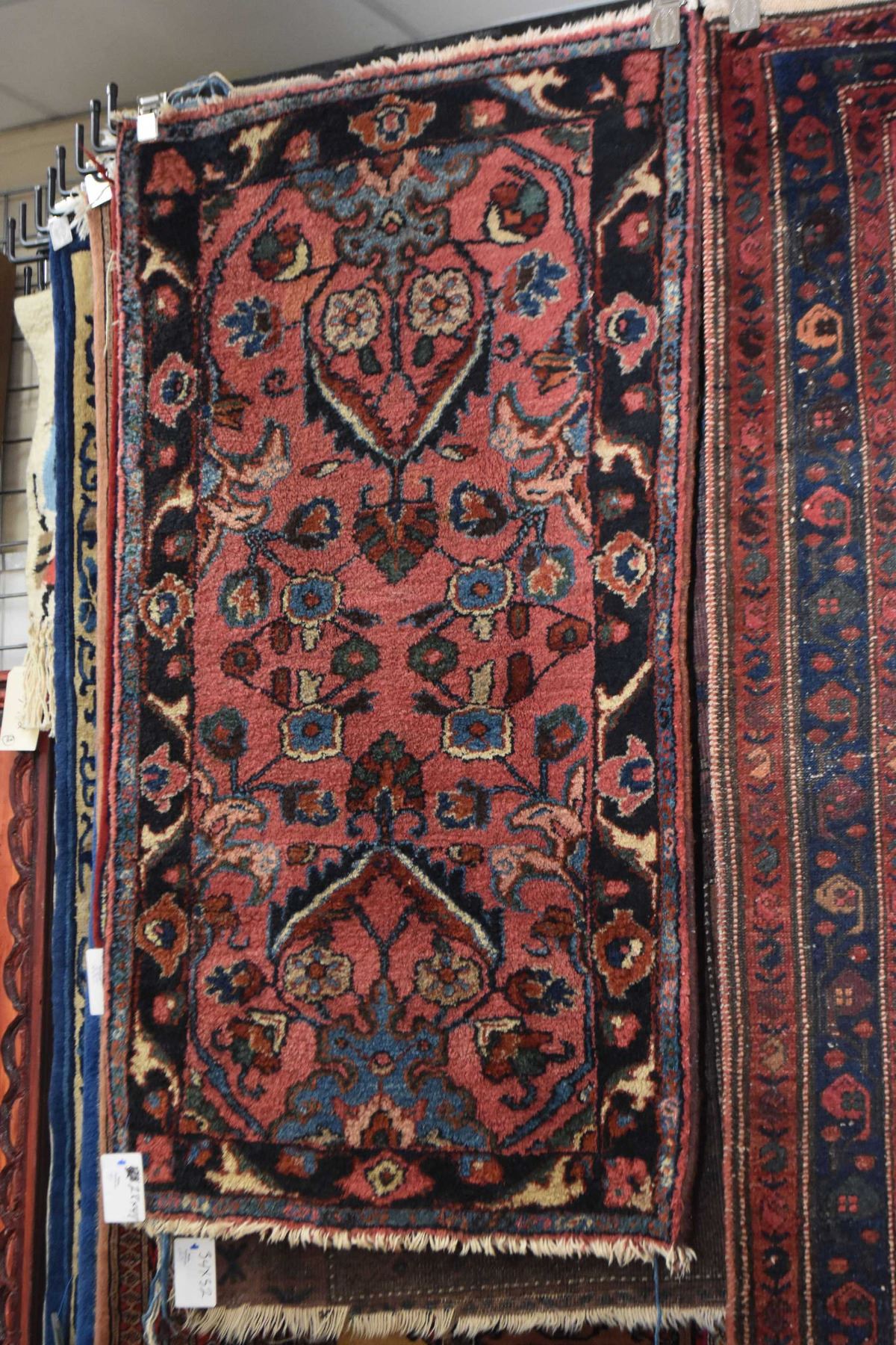 Wool throw rug in shades of dark rose, red and blue, 28" X 48"