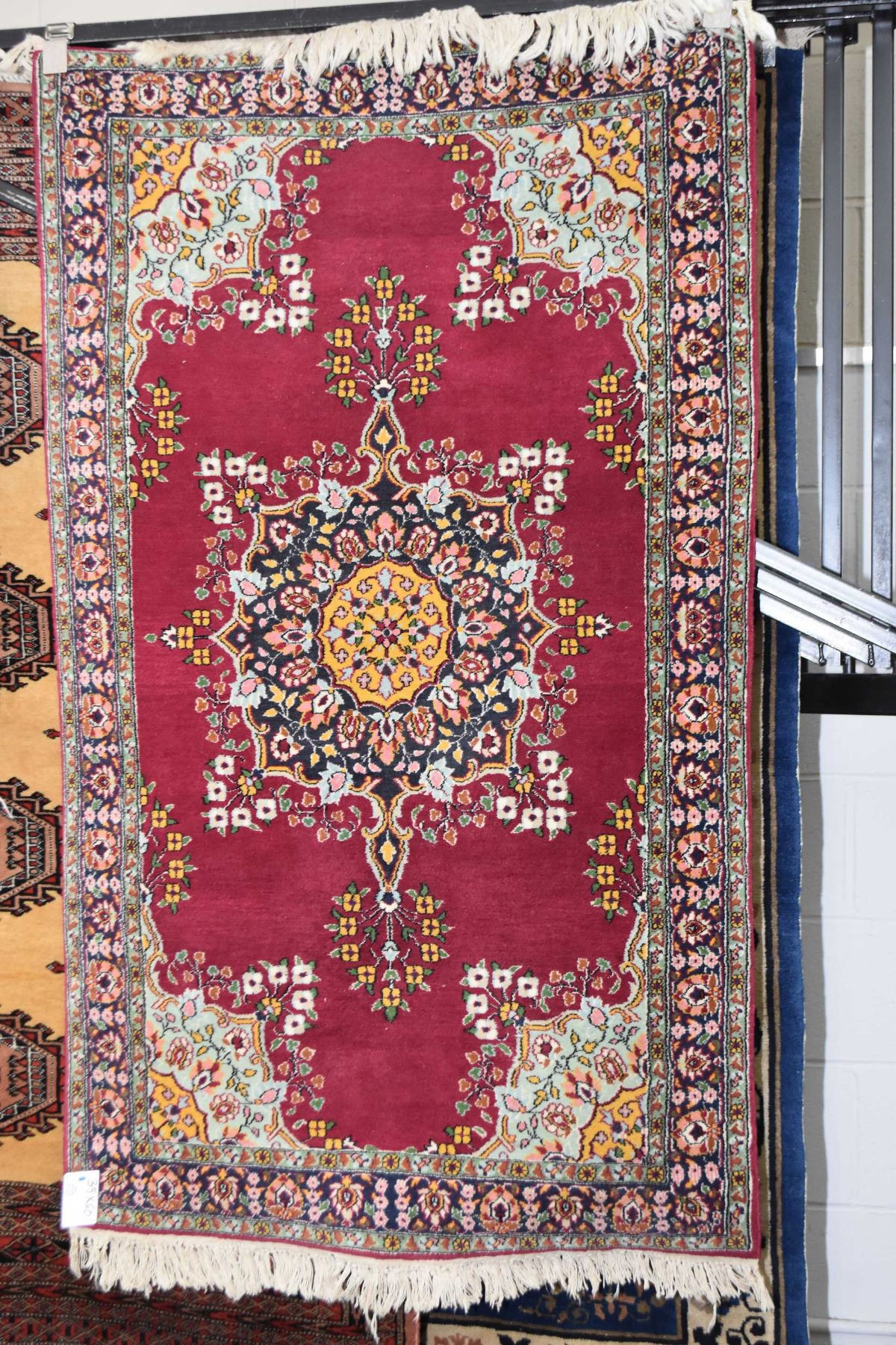 Wool throw rug with center medallion, multiple border in shades of burgundy, green gold and blue 35" X 60"