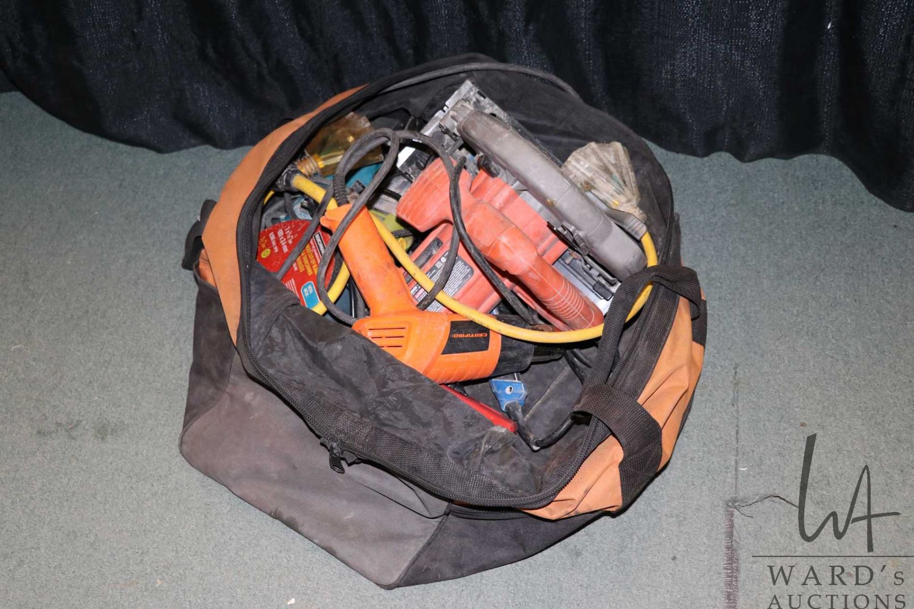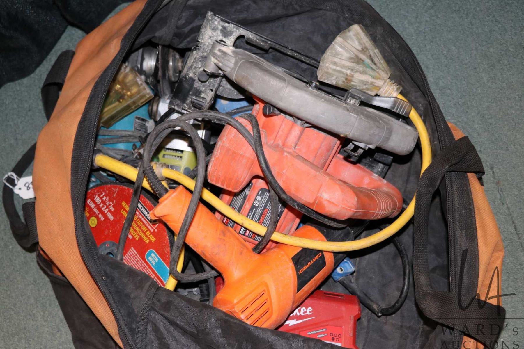Work bag of assorted power tools including Black & Decker circular saw, Mikita angle grinder, Radley