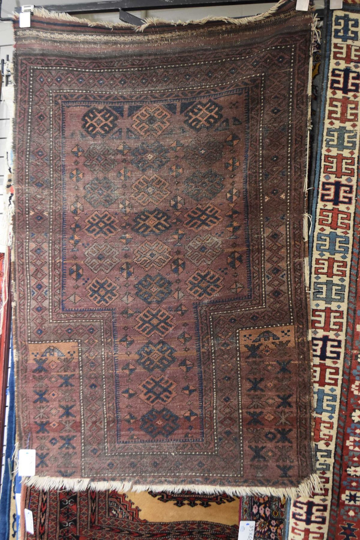 Woven prayer rug in shades of chocolate brown, mauve, and deep blue 34" X 52"