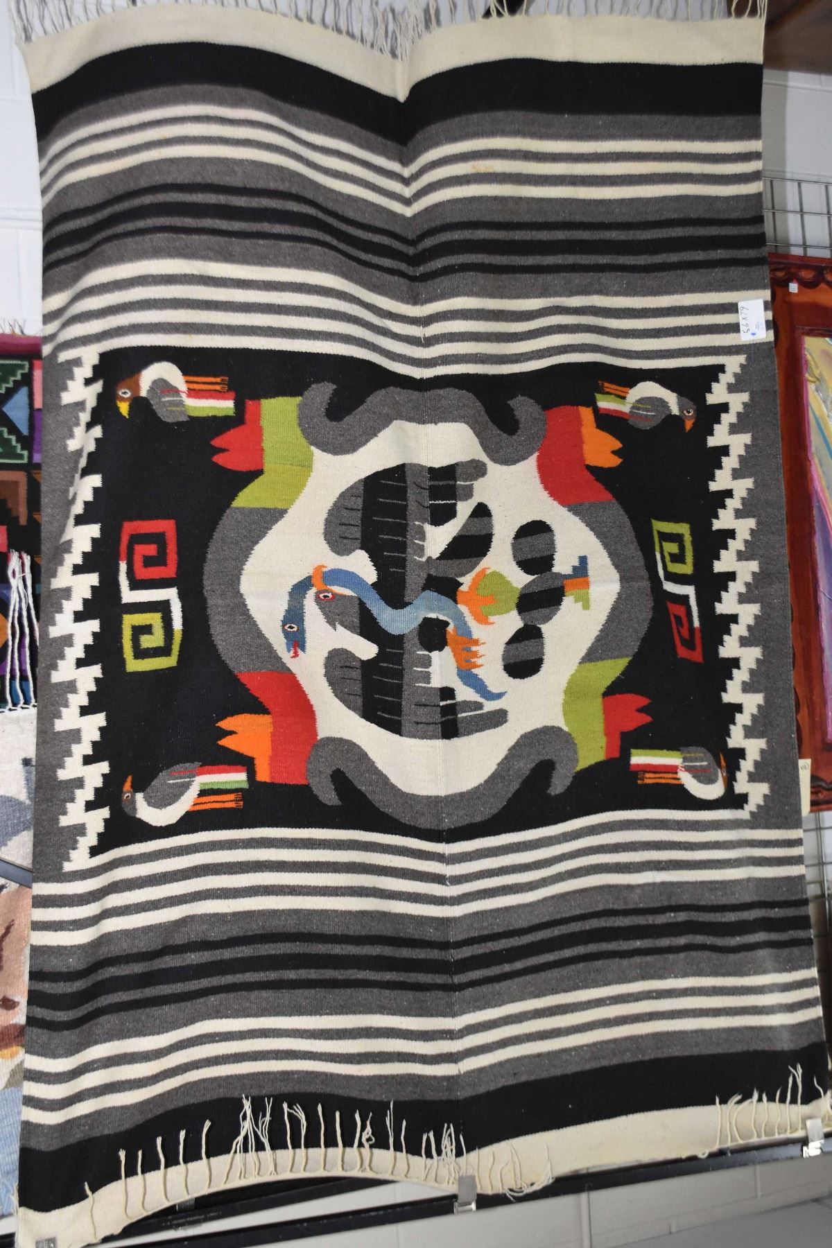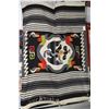 Woven wool blanket with First Nations motif including center medallion featuring a eagle and snake plus birds in grays, blacks, reds, orange and green, 56" X 79"
