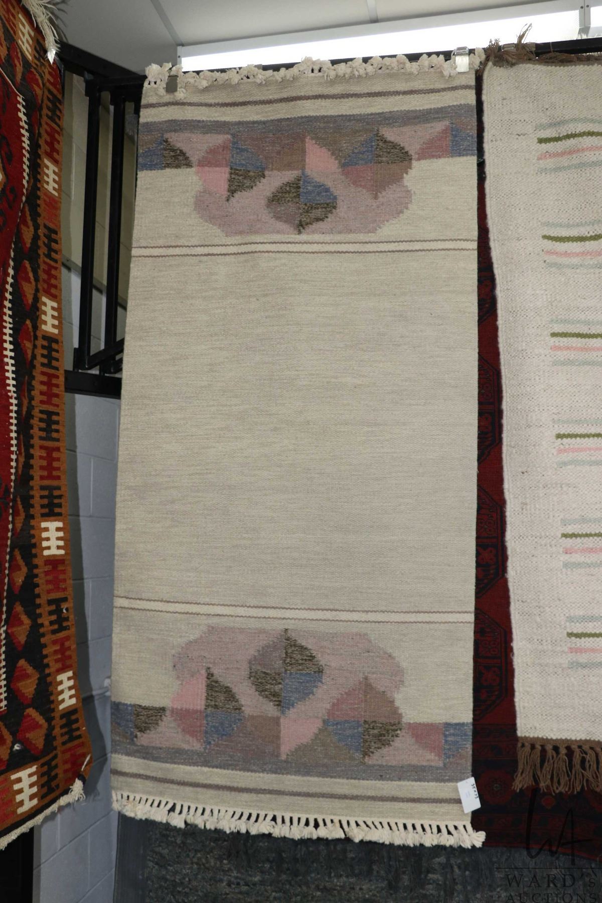 Woven wool carpet in muted shades of cream, pink, taupe, blue etc. 35" X 76"