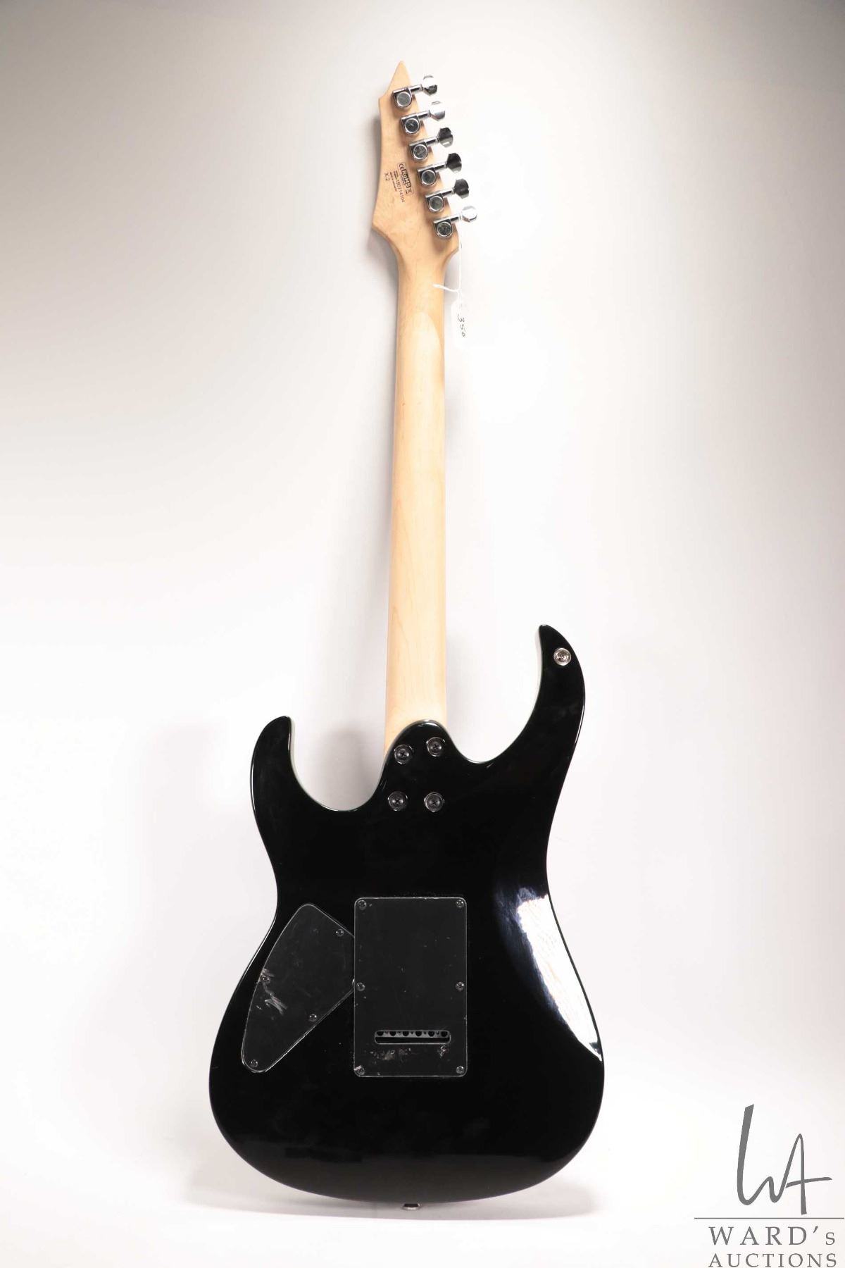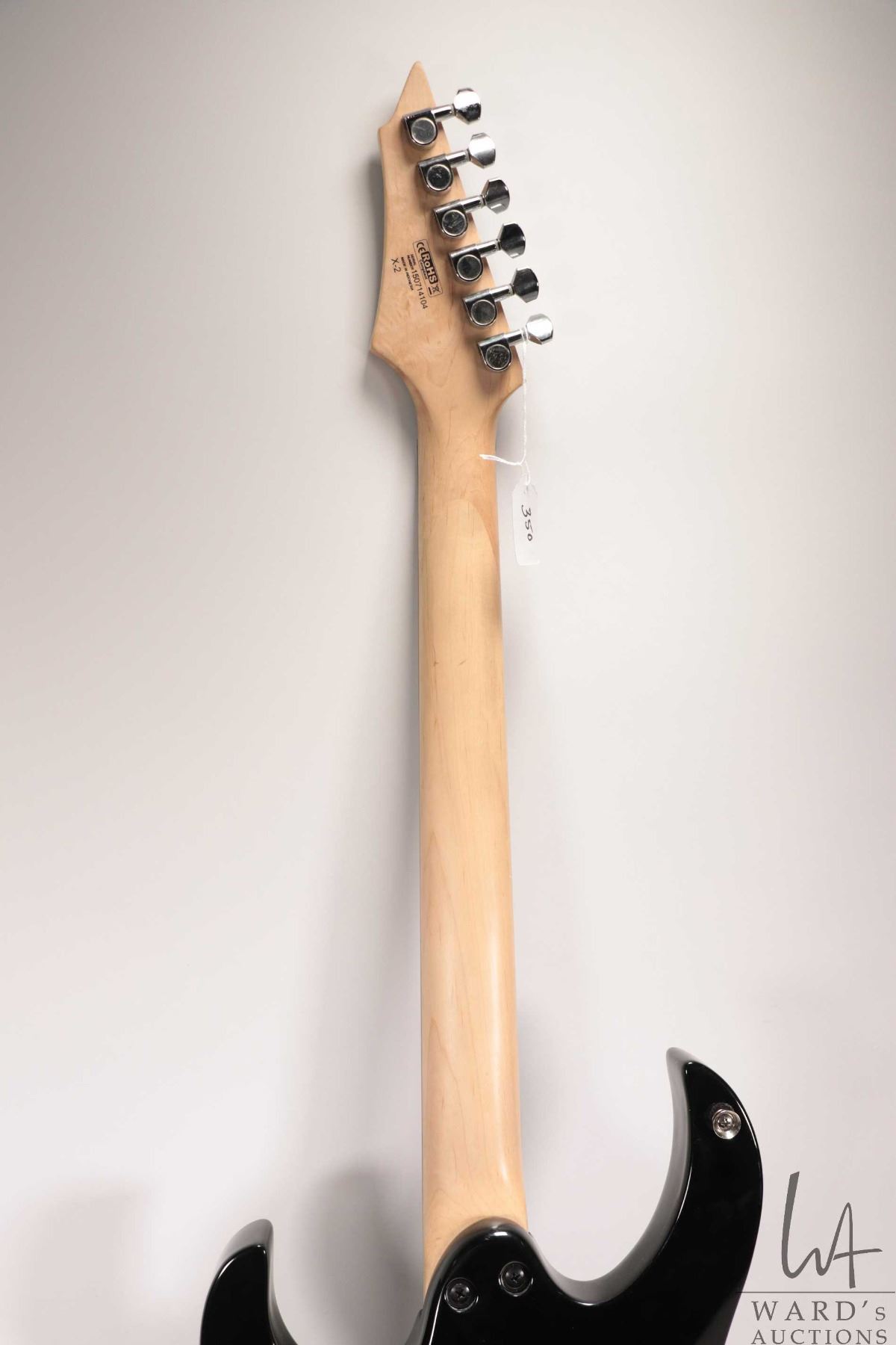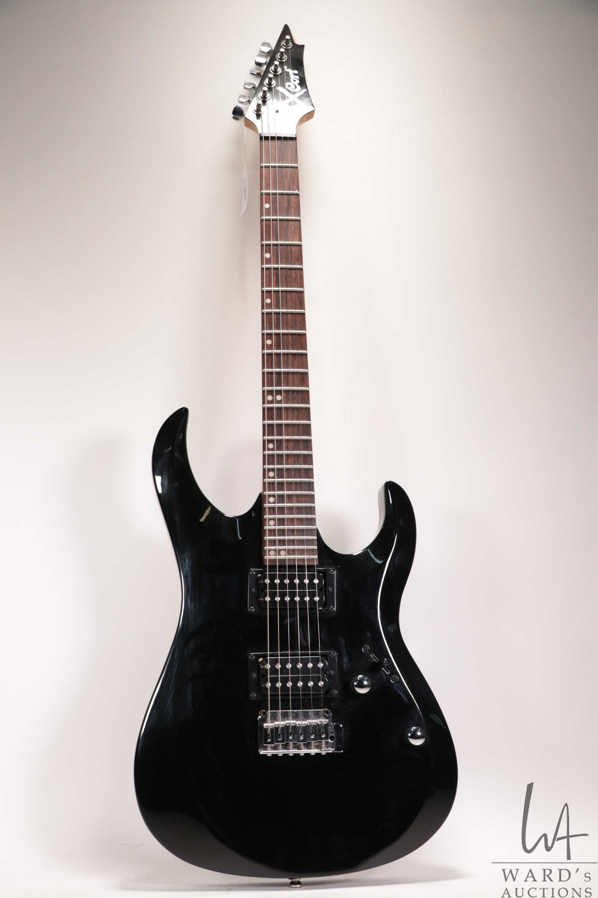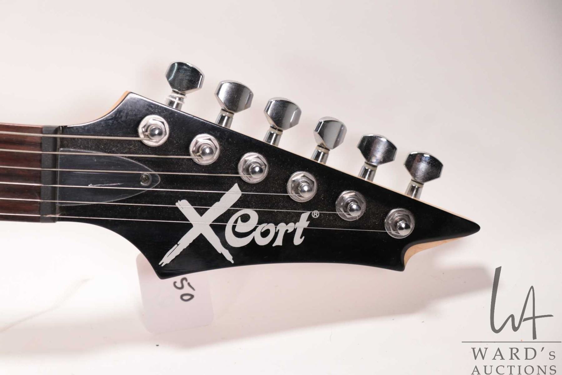 Xcort Superstrat guitar. Beveled top, dual humbuckers, three way switch, black. Serial no. 150714104