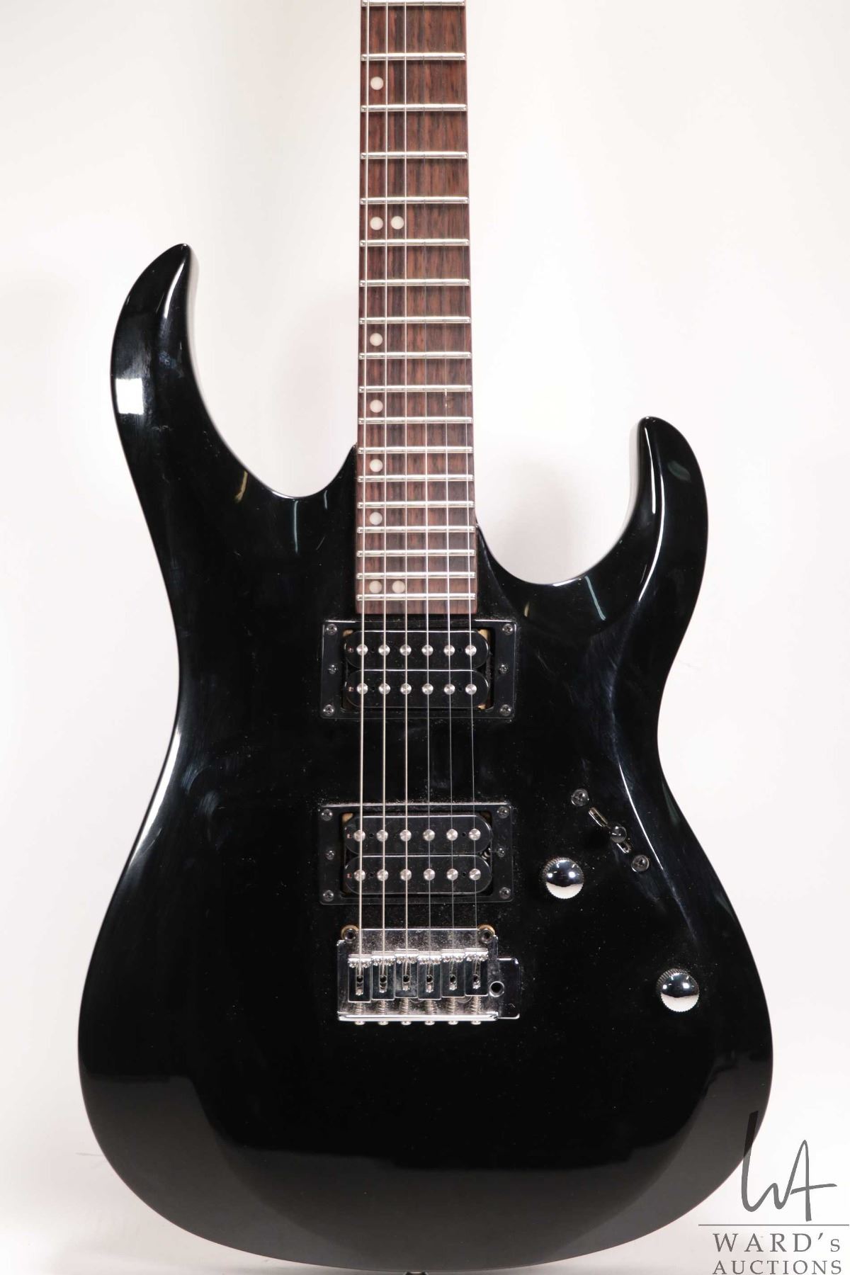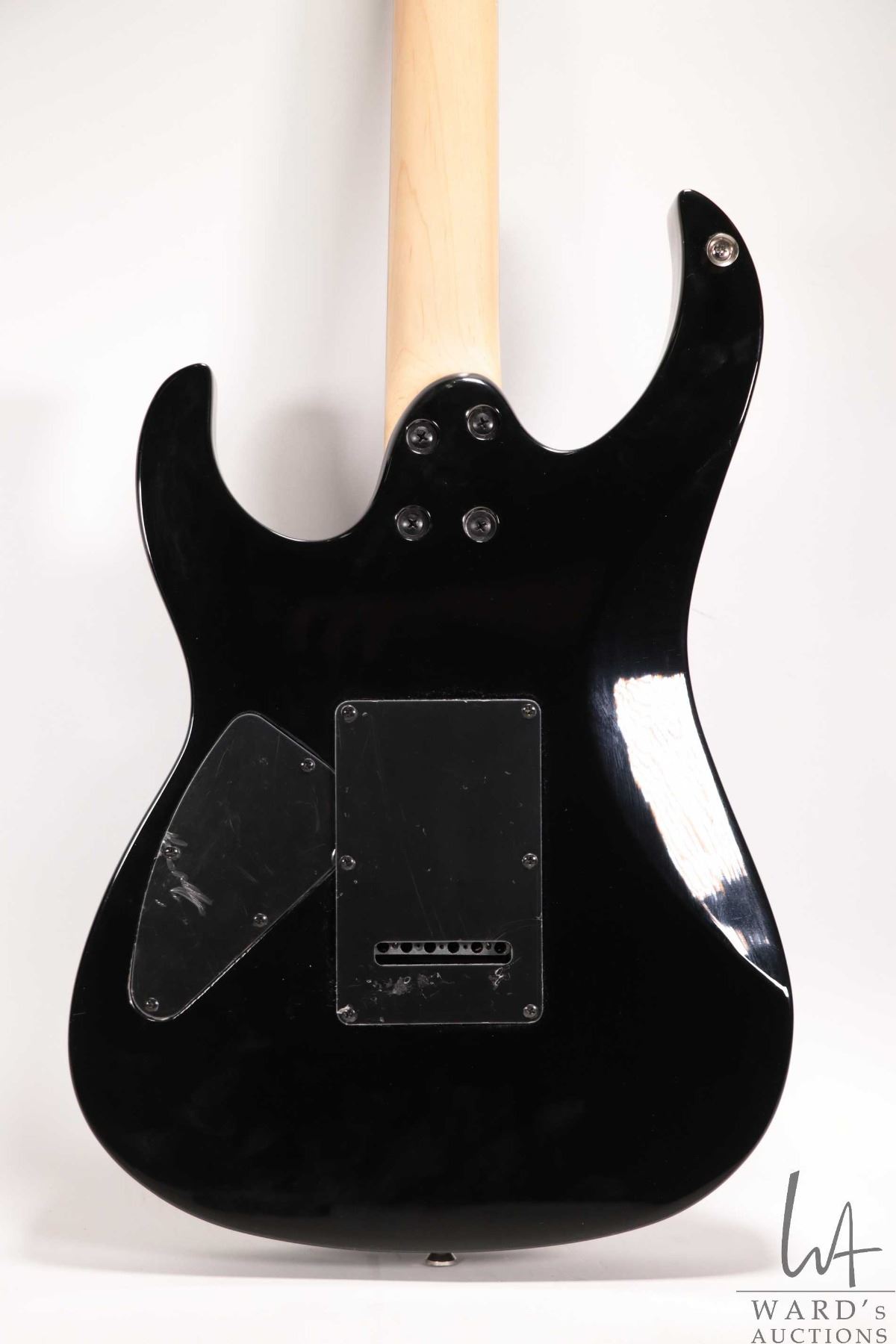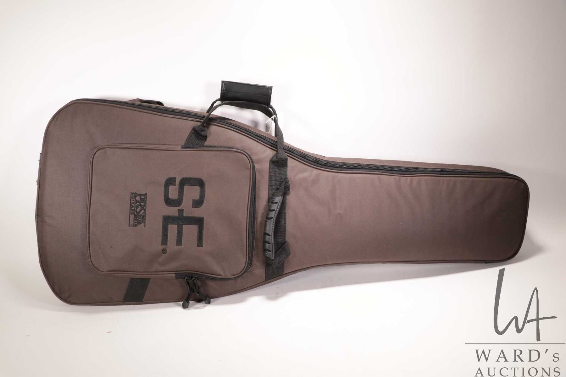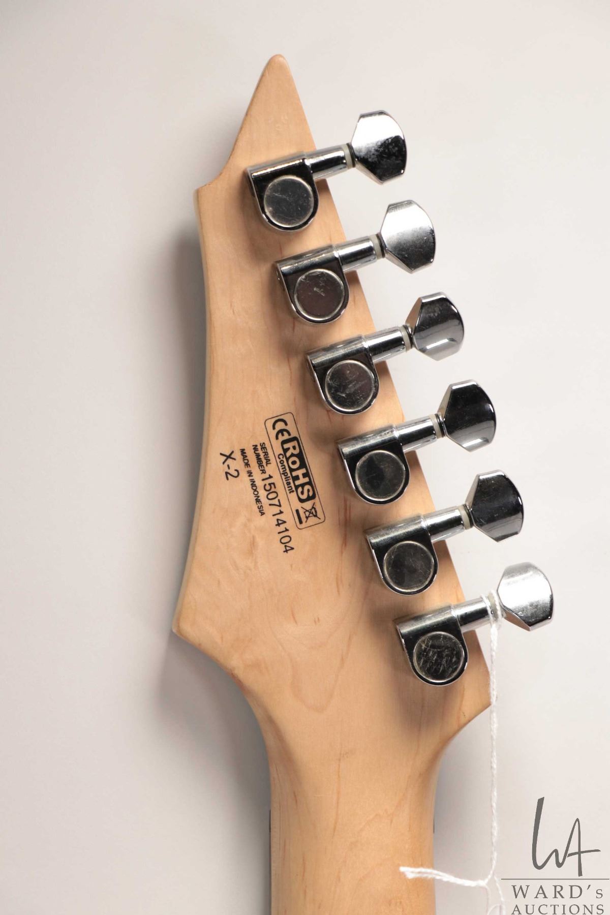 Xcort Superstrat guitar. Beveled top, dual humbuckers, three way switch, black. Serial no. 150714104. PRS Paul Reed style backpack style soft case