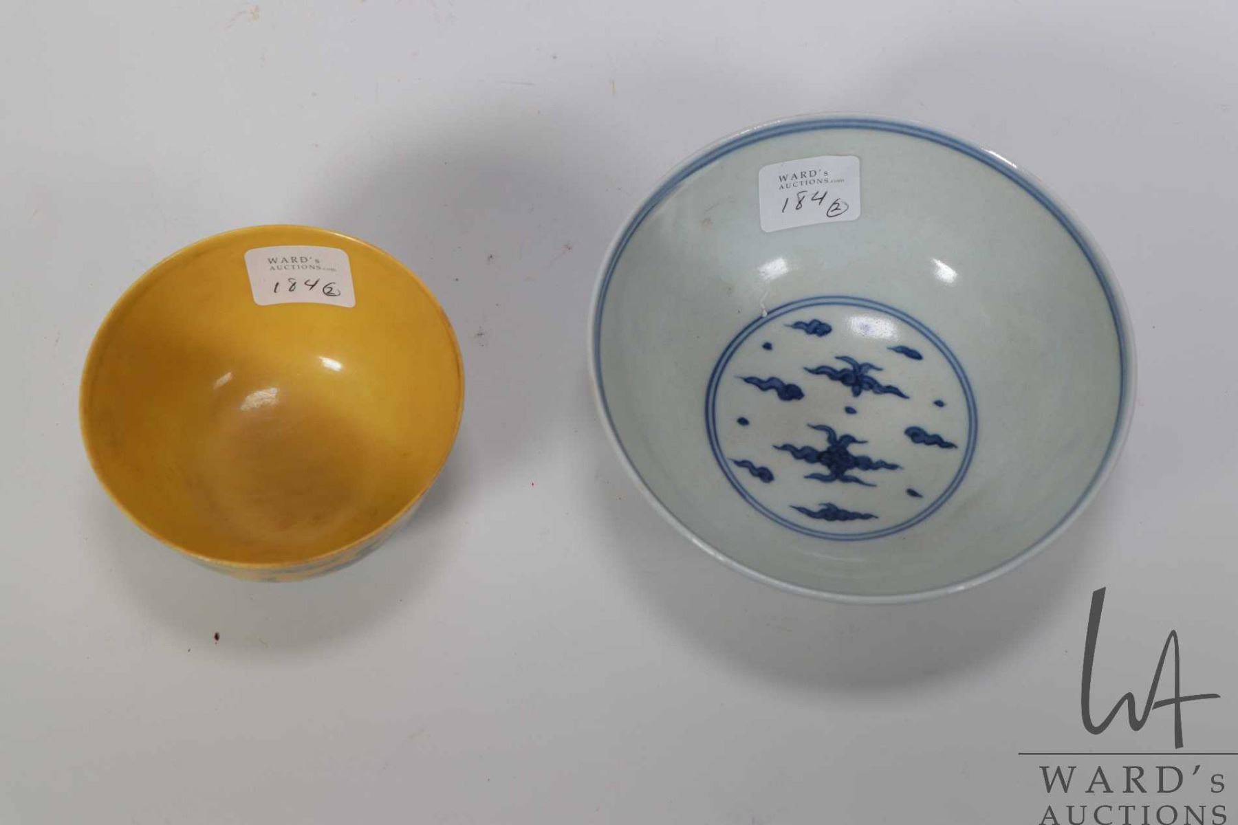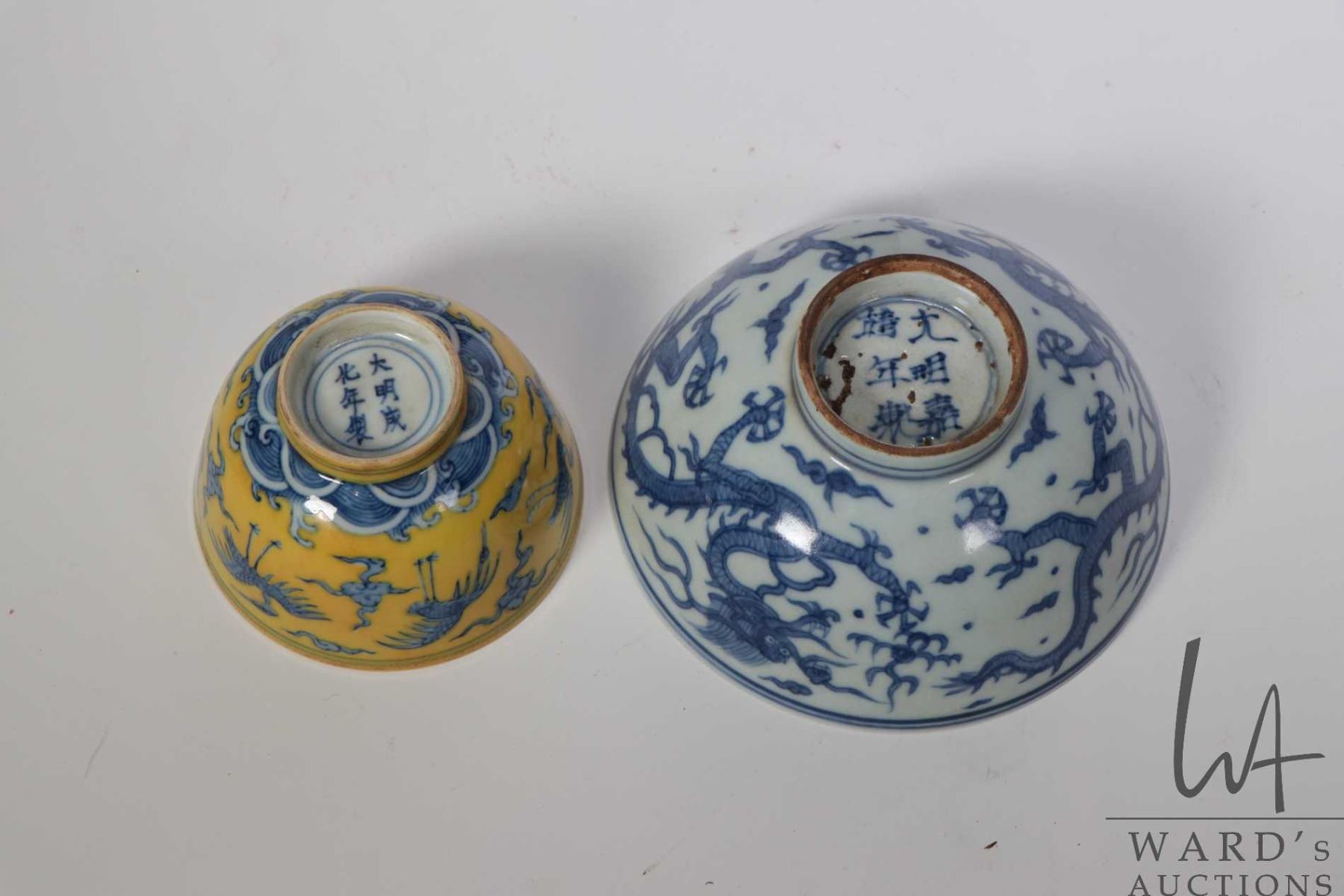 Yellow ground blue tea cup with Ch'eng-hua reign mark 3 1/2" in height and a blue and white "Flaming Dragon" bowl with Chia-Ching reign mark