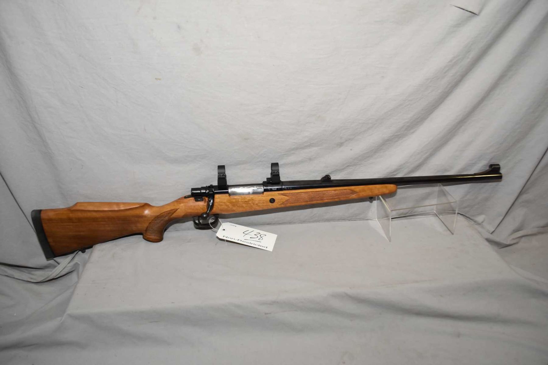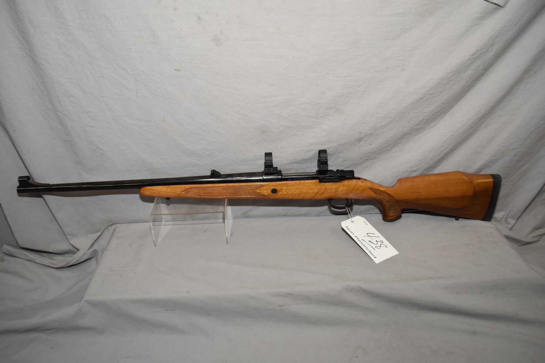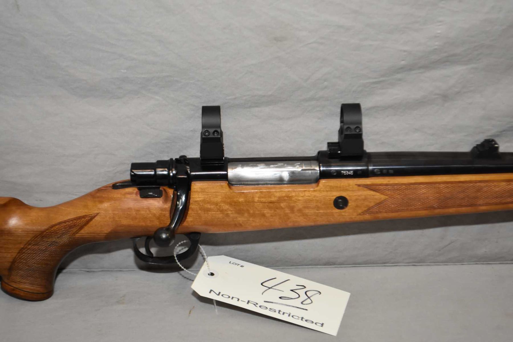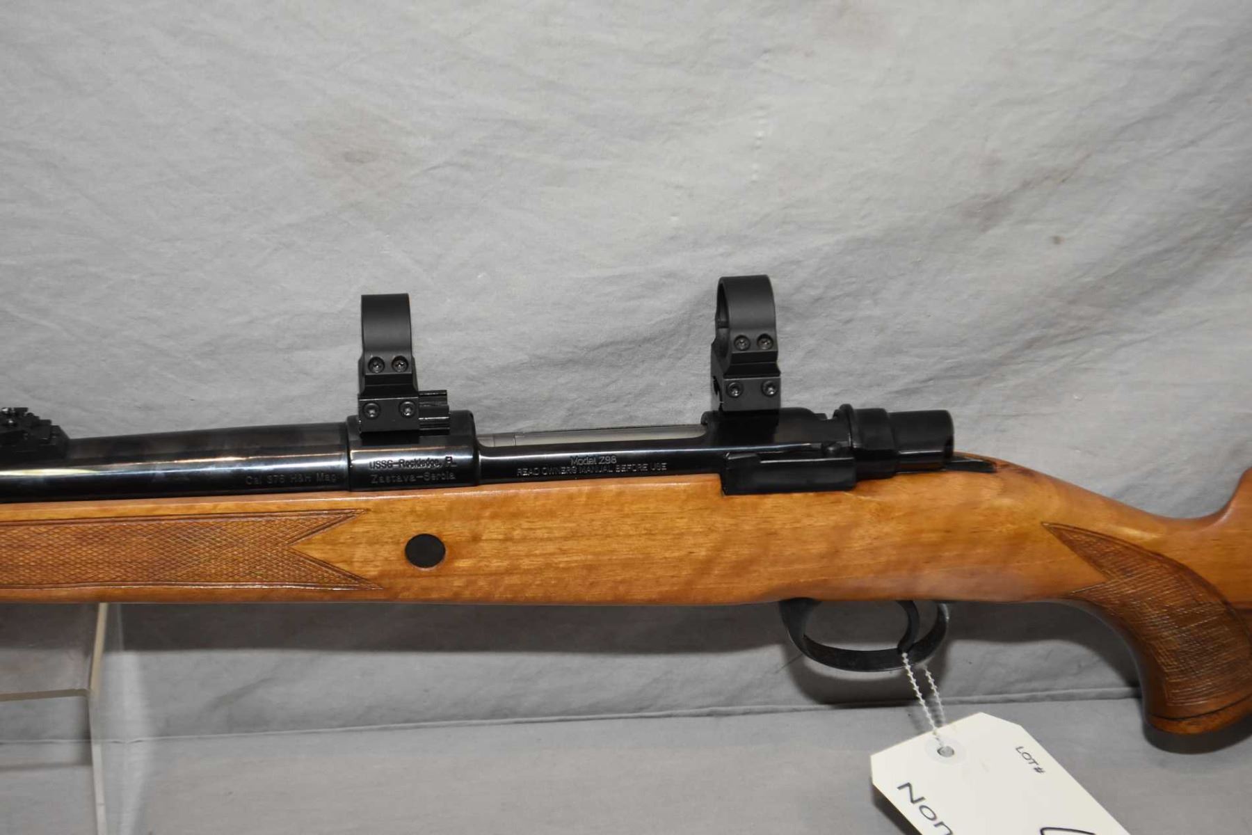 Zastava Model Z98 .375 H & H Mag Cal Bolt Action Rifle w/ 22 1/2" bbl [ appears excellent, blued finish, barrel sights, also rings and bases, swollen checkered pistol grip stock w/ roll over cheek piece, wooden grip cap, Zastava recoil pad, sling studs, slight marks to metal ] Ser # 75345