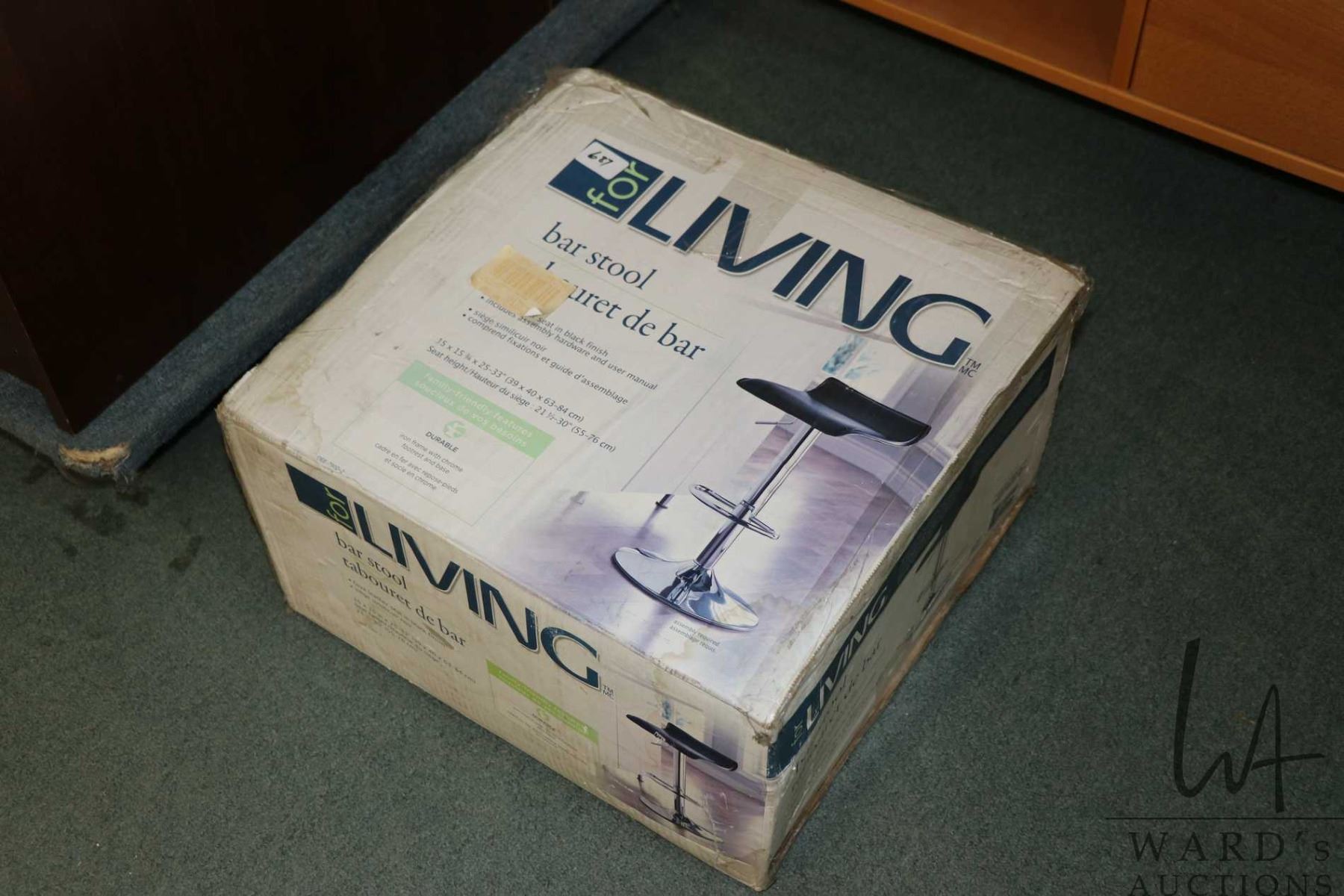 for Living bar stool with black finish and adjustable height, appears new in box, although box has storage damage