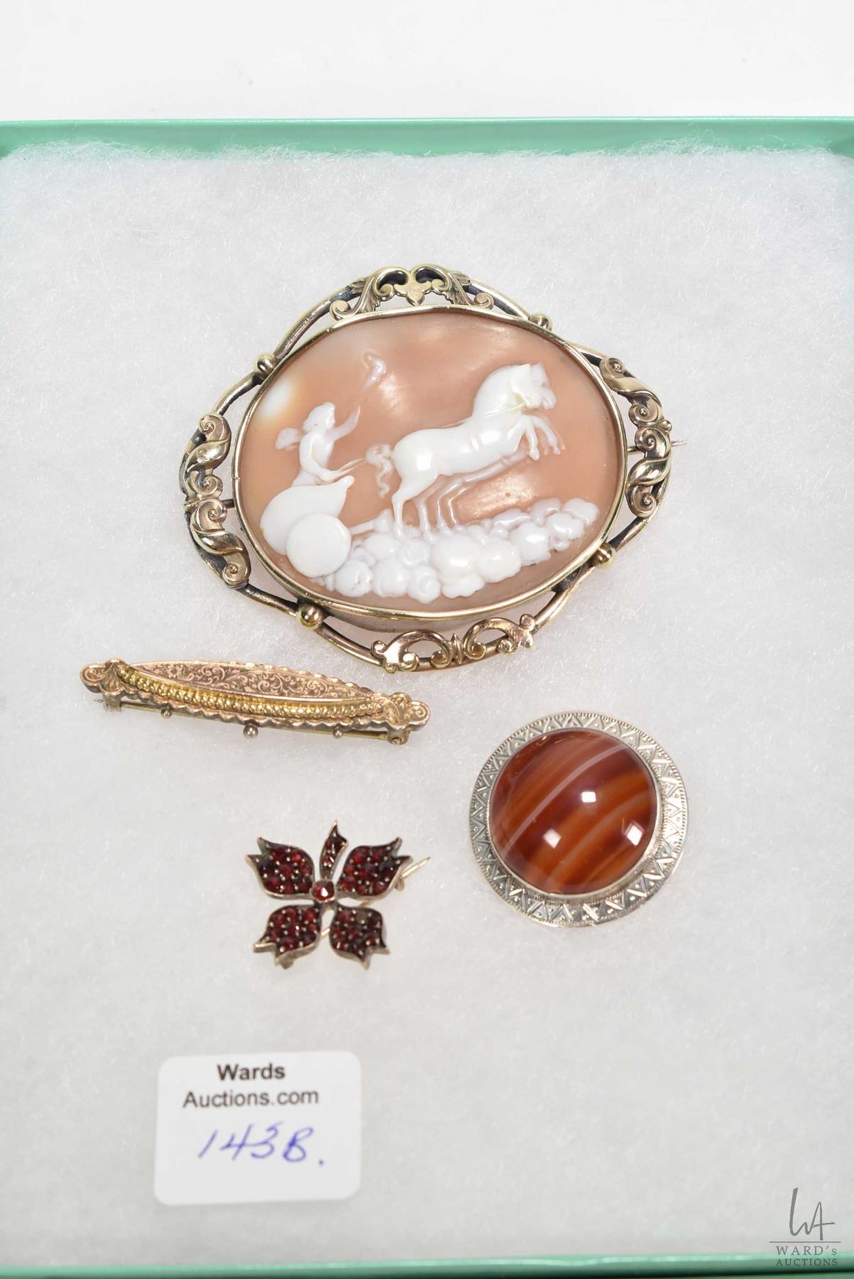 four antique brooches including rolled gold carved cameo, embossed gold bar, Bohemian garnet set brooch and a polished agate brooch set in silver