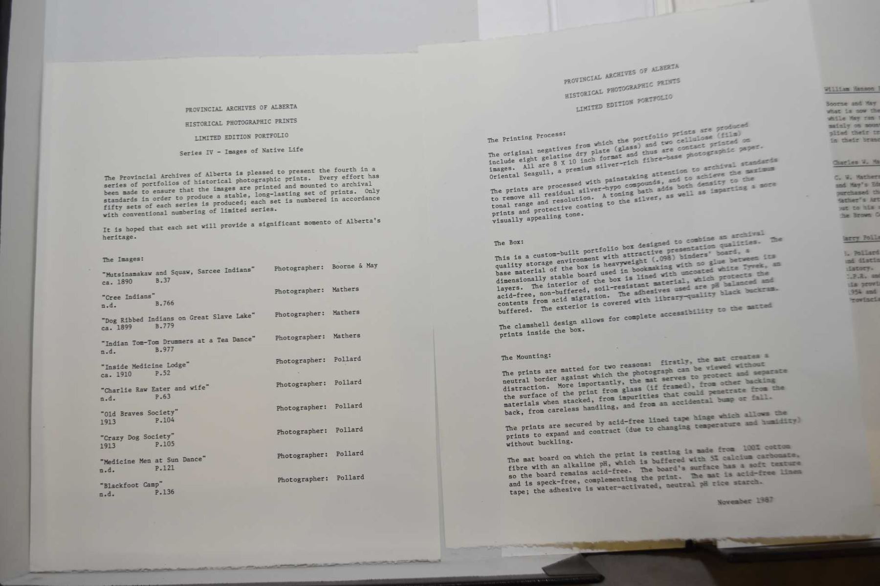 Folio of approximately ten unframed boxed "Provincial Archives of Alberta-Historical Photographic Prints, series IV, Images of Native Life"
