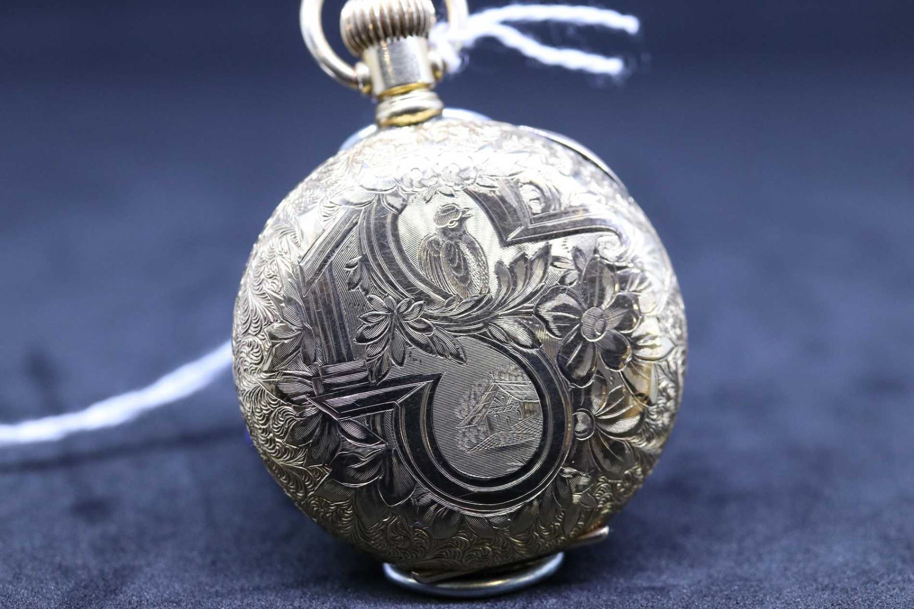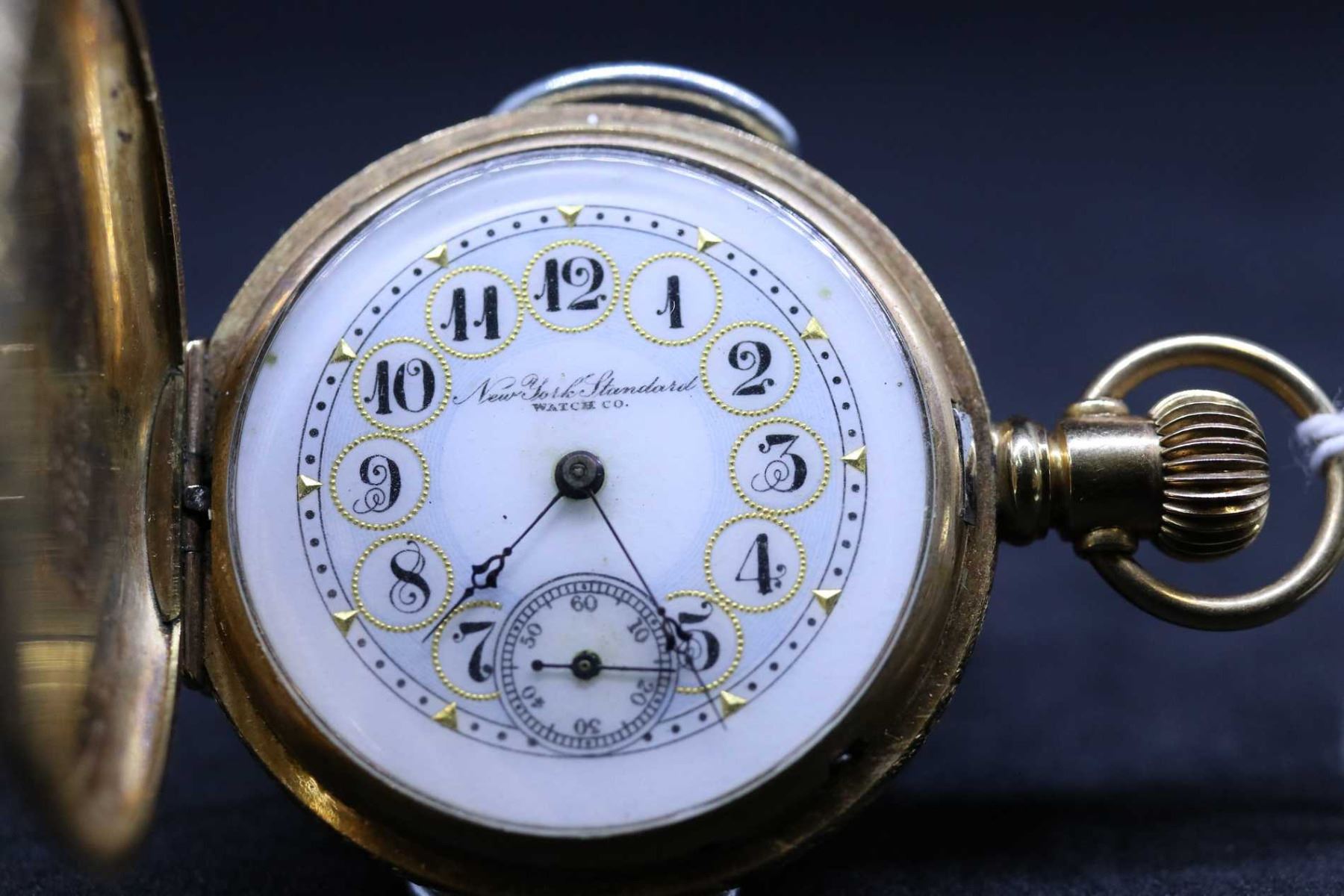New York Standard size "6", 11 jewel pocket watch, serial # 514684, dates to 1894. 3/4 nickel plate stem winder lever set movement signed New York Standard Watch Co. USA with white and pale green single sunk porcelain dial with gold accents, black Arabic numbers with blued arrowhead style hands. In 14kt yellow gold Dueber Special hunter case decorated with ornate leaf and floral design with bird and cottage on back cover. Running at time of cataloguing