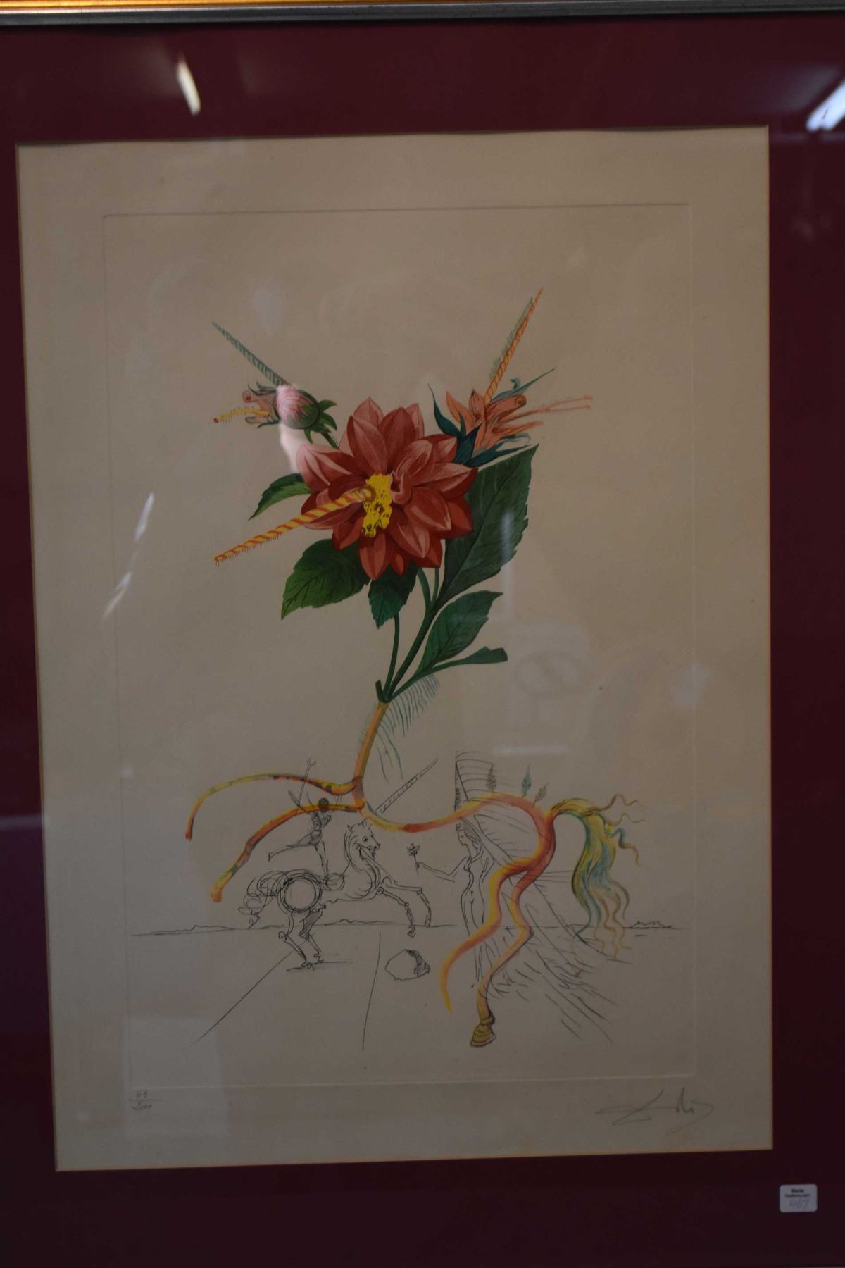 Framed off-set coloured lithograph "Dahlia Unicornis" pencil signed by artist Salvador Dali, 63/200, 27" X 19"