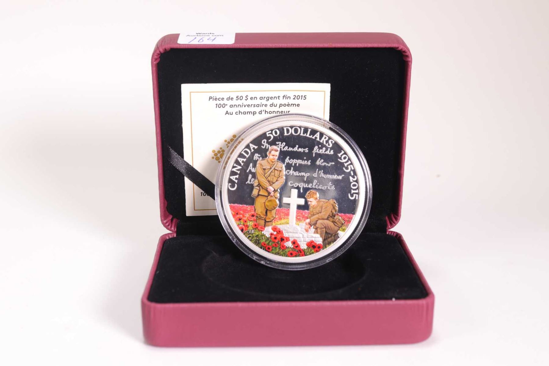 Cased Royal Canadian Mint 2015 $50 fine 99.99% silver 65.25 gram coin "100th Anniversary of In Flander's Fields" originally retailed for $549.95 CAD