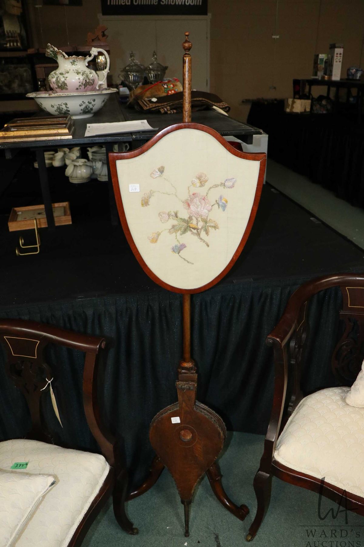 Victorian center pedestal tri-footed shield design draft screen with needlework pattern and carved supports plus an oak and leather fire bellow