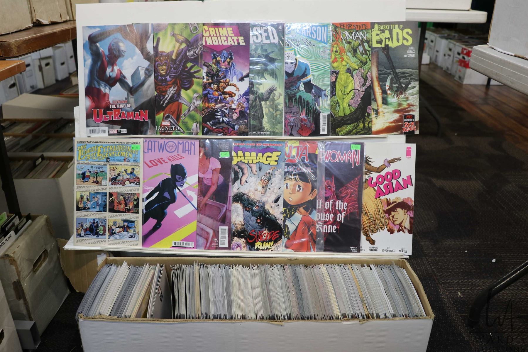 Box of approx. more than 300 comics including Cave Carson, Ninja Highschool, Catwoman, Batwoman, Basket Full of Heads, The Good Asian, etc. Important: Pickup is in Edmonton. Long comic boxes (28 x 8 x 11.5 and 23kg) will be shipped in 2 boxes approximately 11 x 9 x 12 and 13kg each through Canada Post. Long boxes can be palletized for large invoices. Details to follow