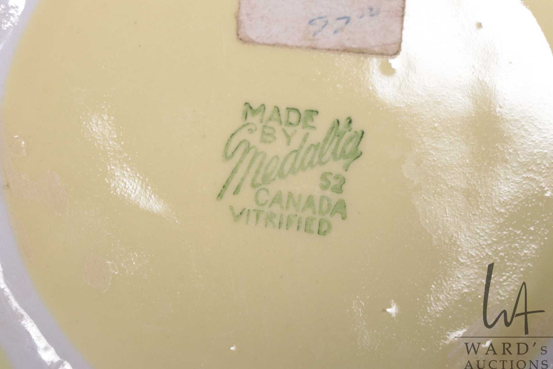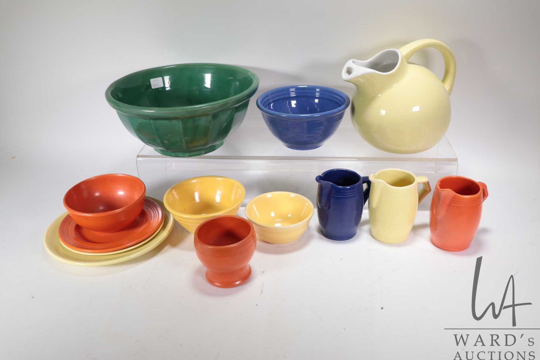 Selection of assorted vintage collectible glazed pottery including Medicine Hat Pottery; three cream jugs, one sugar bowl, three assorted plates, small cereal bowl, plus Medalta Pottery water jug and three unmarked graduated bowls and a Polygon 11" mixing bowl. Note: Not available for shipping. Local pickup only