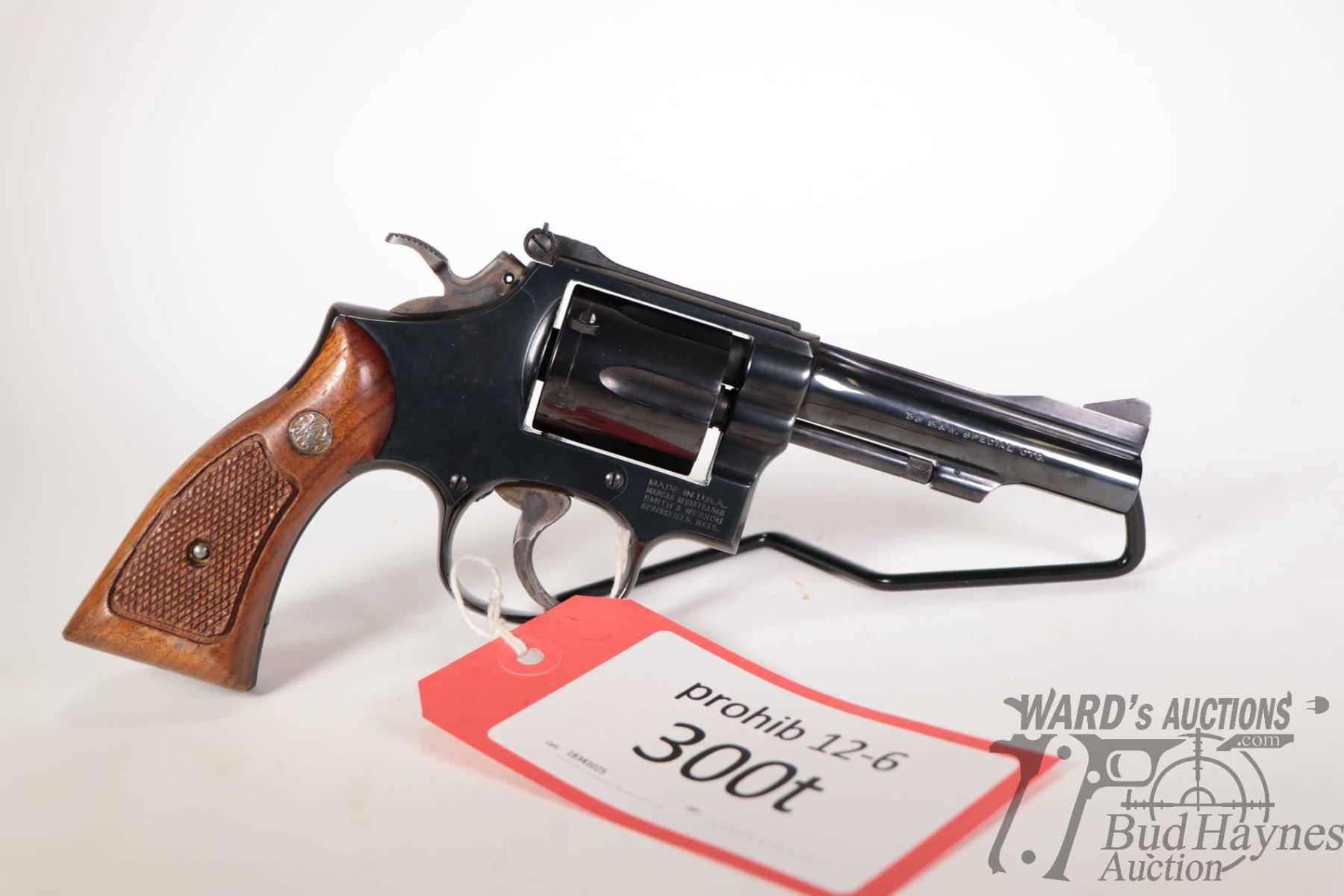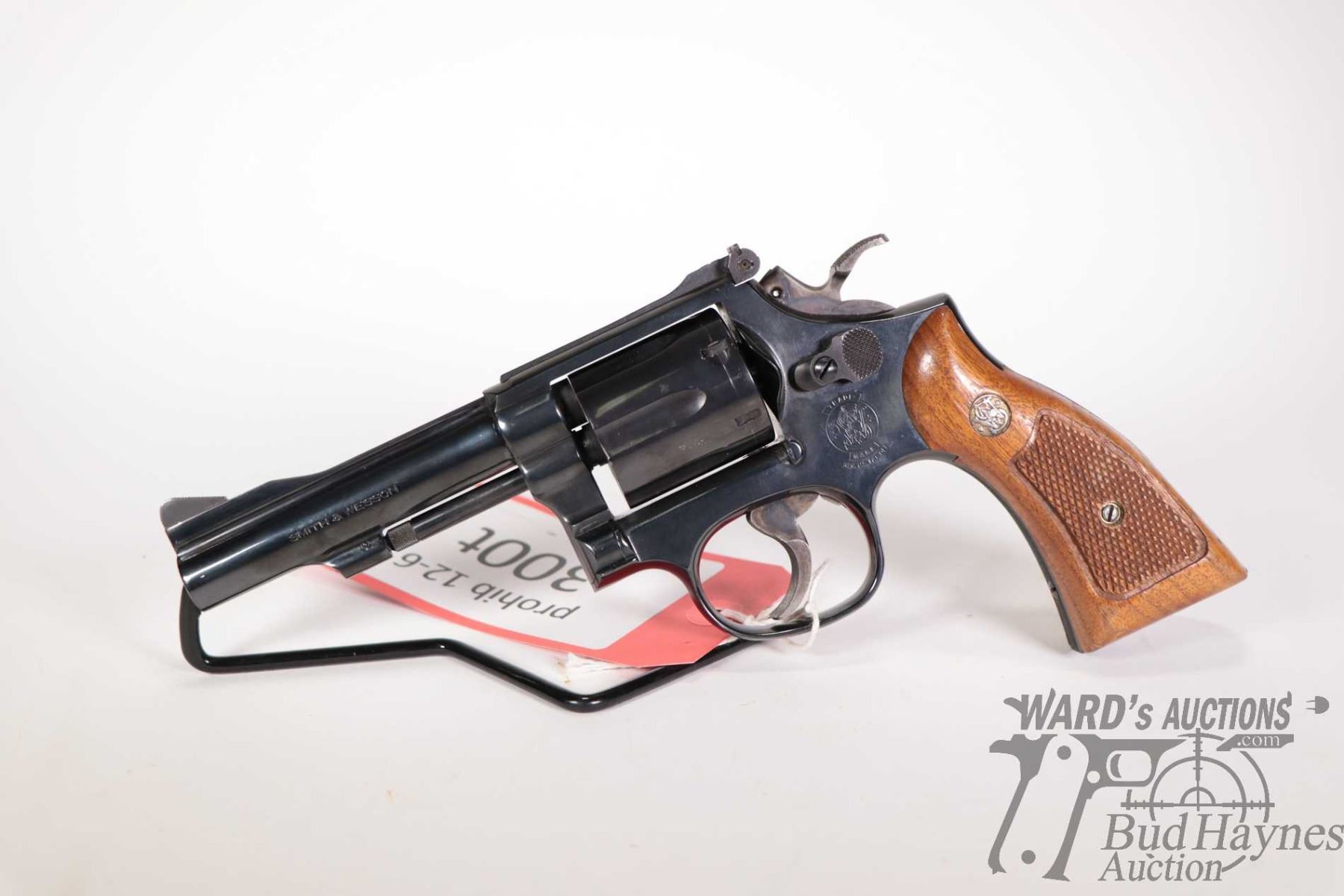 prohib 12-6 handgun Smith & Wesson model 15-4, .38 S&W six shot double action revolver, w/ bbl length 102mm [Blued finished. Fixed front and rear sights. Branded checkered wooden grips. Mechanically appears excellent. Appears to have had only light use. Use, handling and storage marks.] serial # ADU9501, certificate # 18341025, PAL required