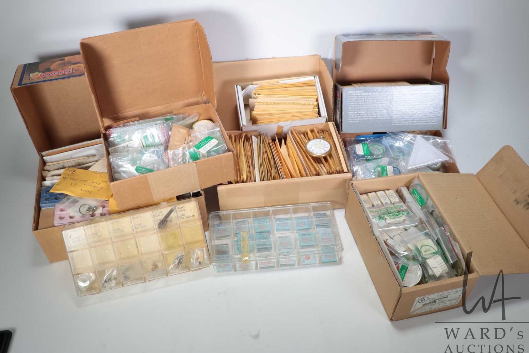 tray lot of watch parts including gears, screws, stems, mainspring, balance staff, crowns, etc.